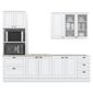 Conceito inspirado nas clássicas cozinhas estilo americano. Um conjunto modular de cozinha sendo 5 peças: 1 balcão de pia 120 cm (sem tampo)(não acompanha pia), 1 balcão de 80 cm (com tampo de 80 cm, usinado para cooktop de 4 bocas, com pré-marcação para cooktop de 5 bocas)(NÃO ACOMPANHA FOGÃO COOKTOP), 1 armário aéreo de 120 cm e 1 torre quente de 72 cm, com espaços para 2 eletros, (espaço para eletros: 1 - A: 42,4 x L: 68,4 x P: 48 cm | 2 - A: 38,6 x L: 68,4 x P: 53,3 cm). Todo o conjunto com estrutura feita 100% MDF de 15mm (fundo com 3mm, tampo em MDP de 25mm), portas com dobradiças metálicas 35 mm com amortecimento sendo 2 portas de vidro, total de 5 prateleiras suportando até 8 kg. Todo o conjunto com acabamento em pintura UV texturizada (fosco), portas e gavetas com detalhes de usinagem em baixo relevo, além do destaque em seus puxadores em metal zamac. Opção de instalação sem pés, suspenso (ferragens para fixação na parede inclusas). Este móvel chegará na sua casa separado em 07 volumes.