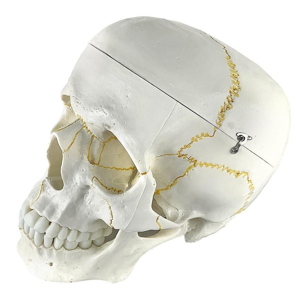 Modelo Anatômico Do Crânio, Em Tamanho Natural, Desmontável Em Até 2 Partes, Evidencia Estrutura Interna, Fissuras Cranianas, Base Do Crânio, Arcada Dentária E Mandíbula Articulável. Confeccionado Em Resina Plástica Rígida. Composto Por: Calota Craniana Arcada Dentária Cavidade Orbitária Frontal Temporal Vômer Nasal Palatino Etmoides Maxila Mandíbula Parietal Zigomático Lacrimal Esfenoide Occipital