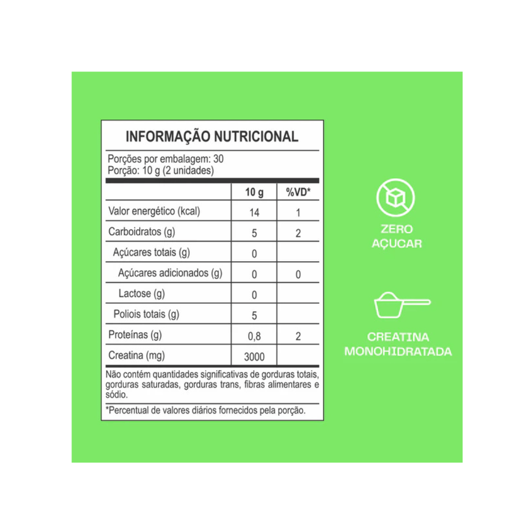 Ingredientes: Creatina Monohidratada, Agente De Massa Maltitol, Gelificante Gelatina, Agente De Massa Sorbitol, Acidulante Ácido Cítrico, Aroma Idêntico Ao Natural De Maçã Verde, Glaceante Cera De Carnaúba, Triglicerídeos De Cadeia Média, Acidulante Ácido Lático, Conservador Sorbato De Potássio, Corantes Artificiais Azul Brilhante Fcf E Tartrazina, Edulcorante Sucralose E Sequestrante Edta Dissódico.