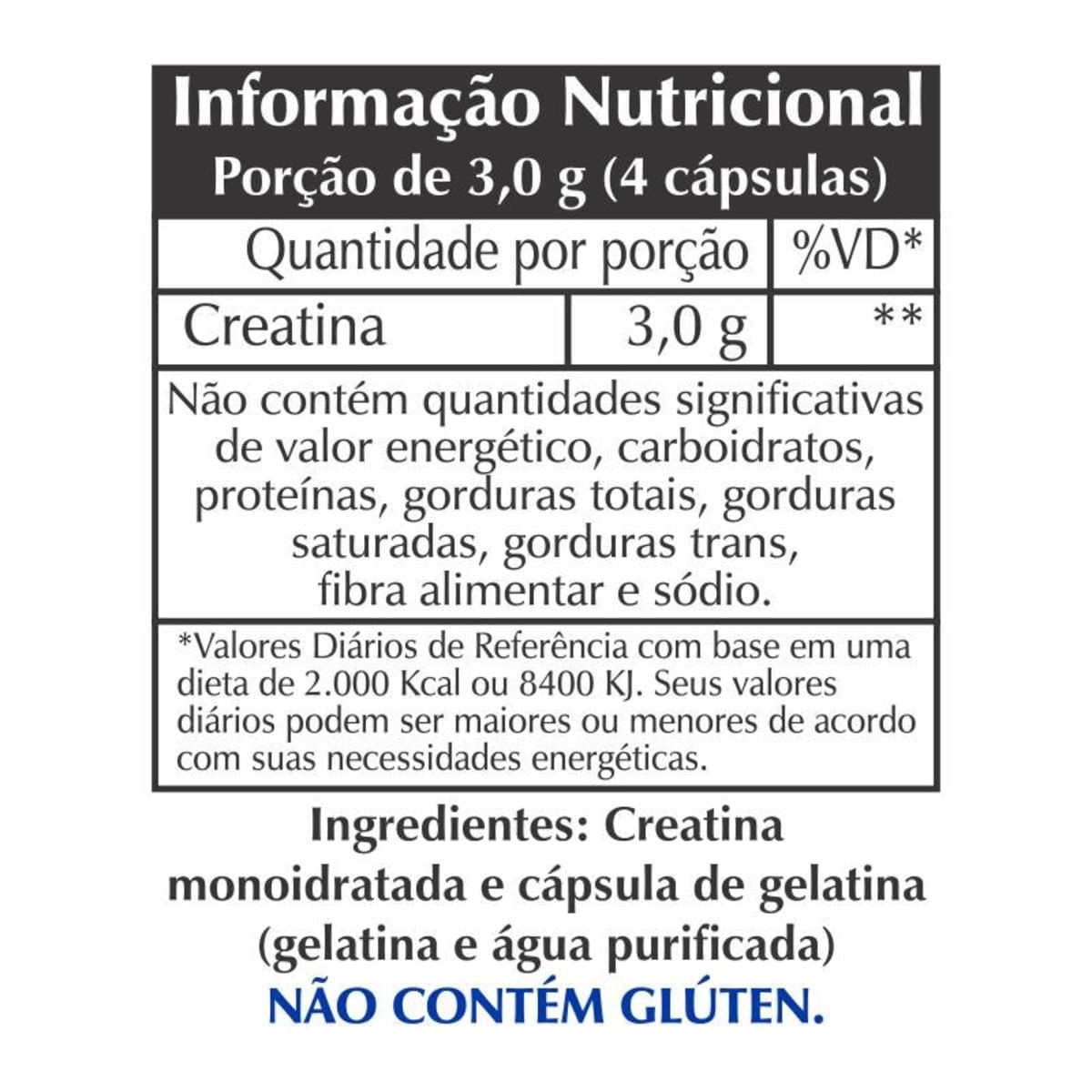 Suplemento para Atletas - Ergogênico - melhora a performance muscular, aumenta o volume, a oferta de energia, e a taxa de produção de energia no músculo...Propriedades:.A Creatina é o suplemento nutricional ergogênico mais eficiente disponível no momento. Colabora com a produção de energia e facilita a utilização da glicose muscular como fonte de energia. Promove aumento da síntese protéica e redução do catabolismo, que favorecem a hipertrofia. A produção de energia aumenta significativamente durante o exercício...Apresentação:.Contém 120 cápsulas contendo 750 mg de creatina monoidratada.Validade de 2 anos a partir da data de fabricação..Ingredientes:.Creatina monoidratada e cápsula de gelatina (gelatina e água purificada).Não contém glúten..Instruções de uso:.Recomenda-se ingerir 2 cápsulas antes e 2 cápsulas logo após o treino, ou conforme orientação profissional..A porção de 4 cápsulas fornece 3 g de creatina..O consumo de creatina acima de 3 g ao dia pode ser prejudicial à saúde.Este produto não deve ser consumido por crianças, gestantes, idosos e portadores de enfermidades..Este produto não substitui uma alimentação equilibrada e seu consumo deve ser orientado por nutricionista ou médico...Cuidados e conservação:.Proteja da luz, calor e umidade..Após aberto, consumir em 60 dias..Produtos fora do prazo de validade não devem ser consumidos...Produto dispensado de Registro - Resolução RDC 27/2010