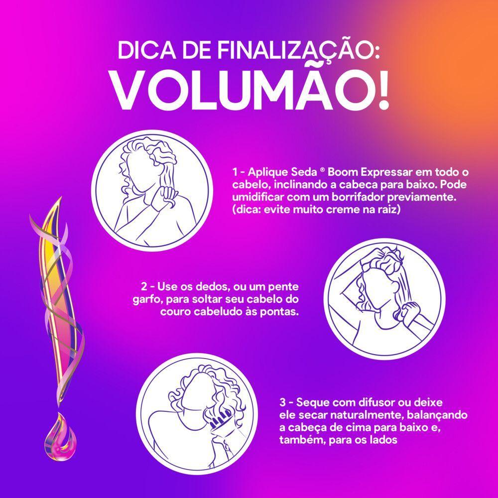 O Creme Para Pentear Seda Boom Volume Máximo Com Exclusiva Tecnologia Pro Curvatura Que Mantém Os Fios Juntos E Alinhados, Memorizando E Ativando Seu Volumão Por 72 Horas A Fórmula Desse Creme Para Pentear Contém Ingredientes Da Natureza Como Leite De Coco E Óleo De Girassol, Para Um Volumão Incrível E Duradouro* A Liberdade Para Você Se Expressar Como Quiser: Seja Para Cabelos Crespos, Cacheados Ou Ondulados, Escolha Seu Creme Para Pentear De Acordo Com A Finalização Que Deseja O Creme Para Pentear Seda Boom Garante 72h De Fragrância Ativa Para Cabelos Mais Perfumados Esse Creme De Cabelo É Liberado, Livre De Petrolatos, Parabenos, Silicone E Óleo Mineral Enquanto Hidrata, O Creme Para Pentear Seda Boom Traz Movimento Para Seus Cabelos. A Vida É Cheia De Possibilidades - Tenha Um Cabelo Incrível Para Todas Elas. Está Pronta Para Conhecer A Nova Geração Seda Boom? O Creme Para Pentear Seda Boom Volume Máximo Une A Tecnologia Pro Curvatura, Que Mantém Os Fios Juntos E Alinhados, Memorizando E Ativando Seu Volumão Por 72h E Uma Poderosa Combinação De Ingredientes Da Natureza. A Nova Fórmula Contém Leite De Coco + Óleo De Girassol, Para Um Volumão Incrível E Duradouro Por 72h, Enquanto Hidrata E Traz Movimento Para Seus Cabelos, Como Ele Merece! Esse Creme De Pentear É Liberado, Livre De Petrolatos, Parabenos, Silicone E Óleo Mineral Em Sua Composição. Na Nova Linha Seda Boom Você Escolhe Seu Creme Para Pentear De Acordo Com A Finalização Que Deseja, Afinal Seja Cabelos Crespos, Cacheados E Ondulados, Você É Livre Para Se Expressar Como Quiser. Para Expressar O Volume E Definição Do Seu Cabelo Siga A Dica De Finalização: Volumão Ostentação! Aplique Seda Boom Expressar Em Todo O Cabelo, Inclinando A Cabeça Para Baixo. *teste Instrumental Em Comparação Com O Uso Conjunto De Shampoo E Condicionador Básicos.