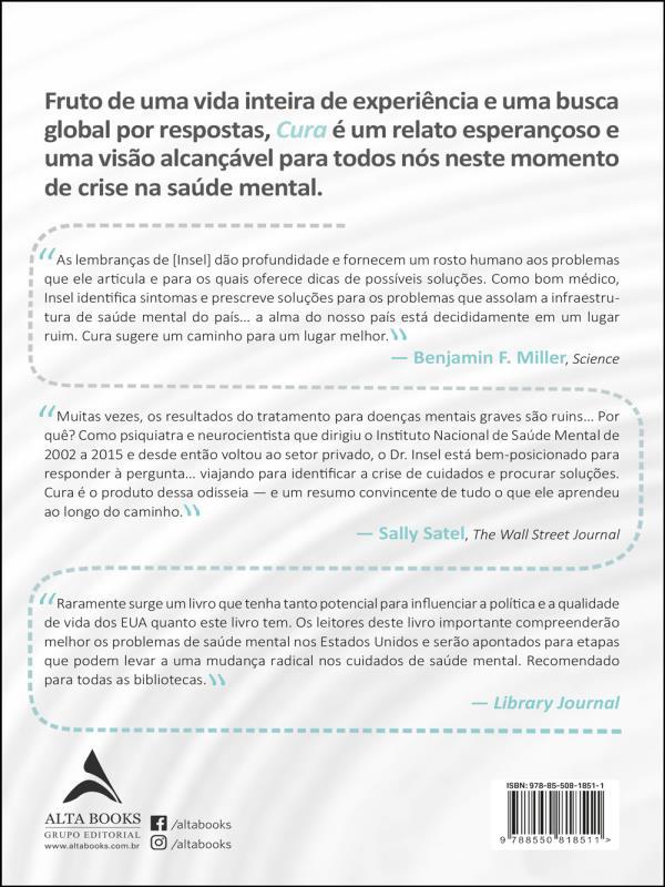 as Lembranças De [insel] Dão Profundidade E Fornecem Um Rosto Humano Aos Problemas Que Ele Articula E Para Os Quais Oferece Dicas De Possíveis Soluções. Como Bom Médico, Insel Identifica Sintomas E Prescreve Soluções Para Os Problemas Que Assolam A Infraestrutura De Saúde Mental Do País… A Alma Do Nosso País Está Decididamente Em Um Lugar Ruim. Cura Sugere Um Caminho Para Um Lugar Melhor.— benjamin F. Miller, science
