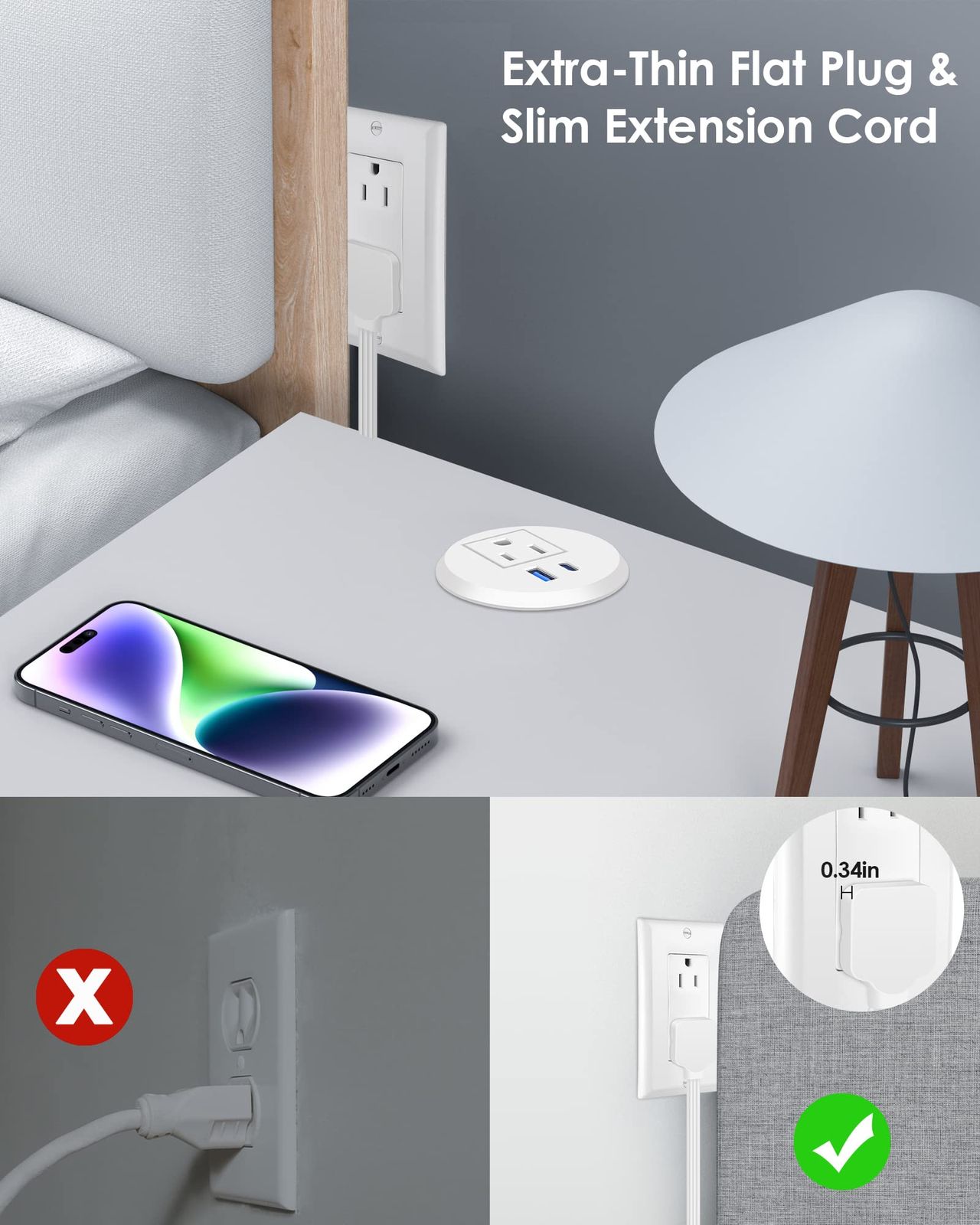 - Saída Usb Com Ilhós Embutido: Com Plugue Plano Extra Fino E Cabo De Extensão Fino De 3 Mm. Plugue Ultrafino De 0,94 Cm E Design De Ângulo Reto De 45 Graus, Maximiza A Economia De Espaço No Seu Plugue. Saída De 125v/12a/1500w. Extensor De Tomada Com Cabo De 1,8 M.