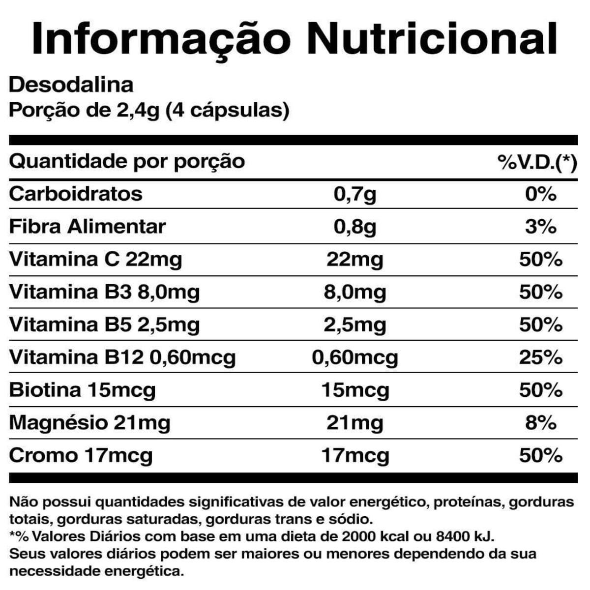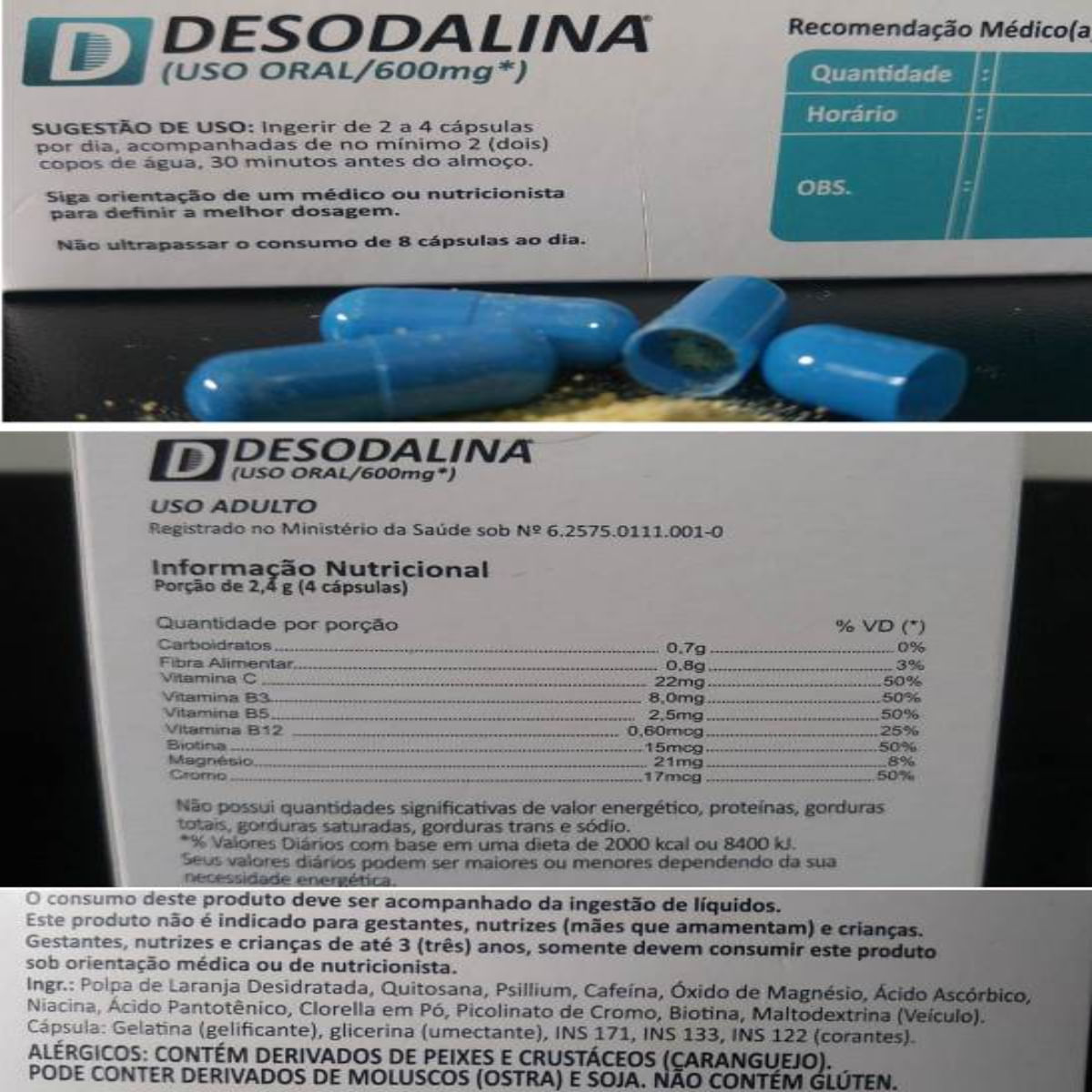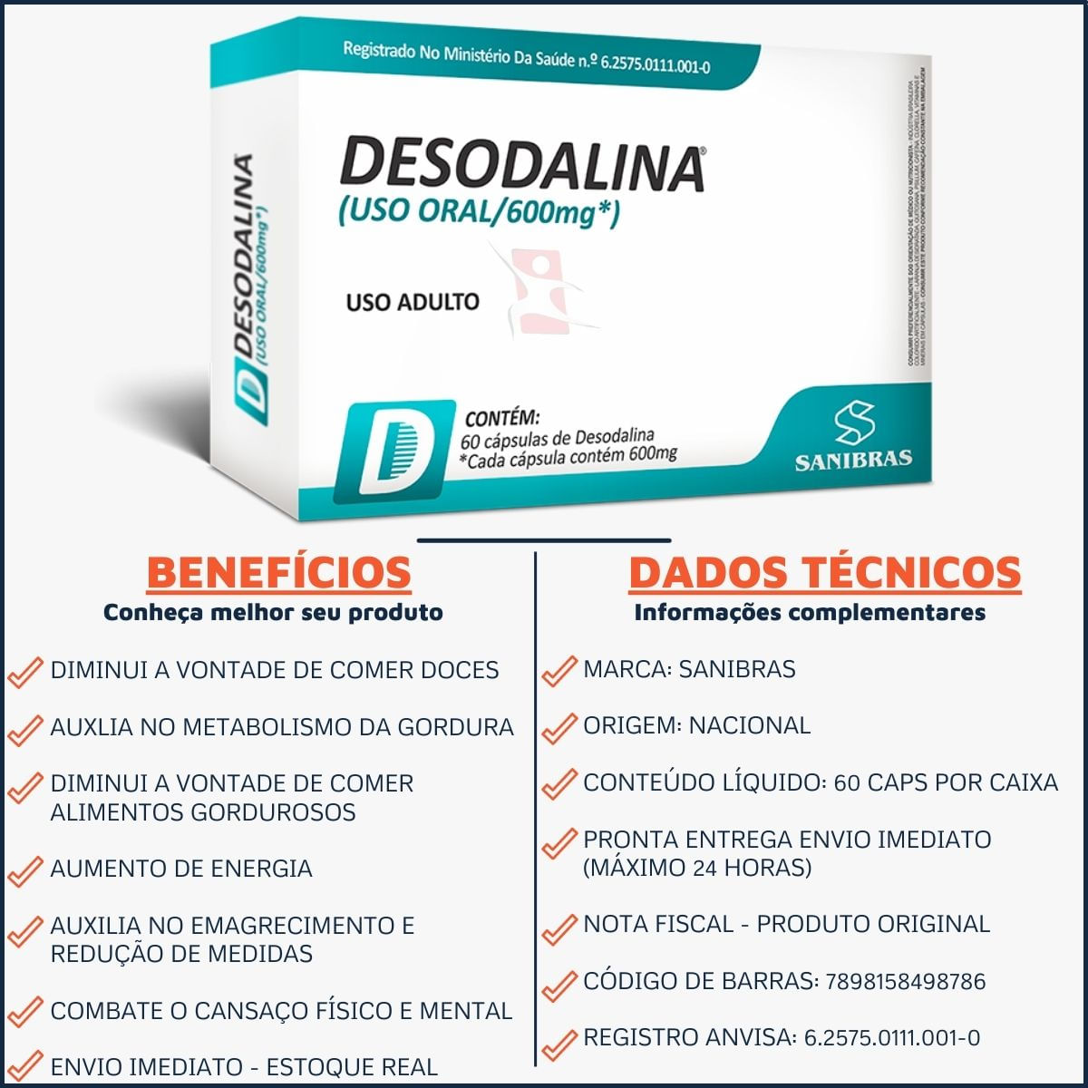 Desodalina Redução De Medidas E Regulador Do Apetite Com 60 Cápsulas– Sanibras — Descrição — Indústria Do Corpo Desodalina Da Sanibras É Um Suplemento Termogênico Queimador De Gorduras E Controlador De Apetite, A Base De Cafeína (210mg Por Porção), Quitosana E Picolinato De Cromo. As Cápsulas Azuis Do Desodalina Possuem Ação Em 3 Estágios Distintos: No Sistema Digestivo, No Seu Metabolismo E No Seu Intestino. – Sistema Digestivo: Os Ativos Das Cápsulas Azuis Impedem Que A Gordura Ingerida Pela Comida Fique Acumulada No Seu Corpo, Eliminando Grande Parte Da Gordura Dos Alimentos Sem Que Seja Absorvida No Seu Estômago. - Acelerando O Metabolismo: Desodalina Atua Ativando O Metabolismo Para Acelerar A Queima De Gordura E Diminuindo Drasticamente Sua Fome. O Interessante É Que A Função É Metabólica E Não Tem Ação Em Seu Cérebro, Tratando-se De Um Corte Na Fome De Ação Bem Natural E Sem Colaterais. – Intestino: Sua Fórmula Auxilia No Trânsito Intestinal, Contribuindo Para Que Sua Dieta Tenha Melhor Eficiência. O Consumo Deste Produto Deve Ser Acompanhado Da Ingestão De Líquidos. — Benefícios — indústria Do Corpo - Diminui A Vontade De Comer Doces, - Diminui A Vontade De Comer Alimentos Gordurosos, - Auxilia No Emagrecimento, - Auxilia Na Redução De Medidas, - Acelera O Metabolismo, - Promove Aumento De Energia Durante A Atividade Física Aeróbica, - Definição Muscular, - Combate O Cansaço Físico E Mental. — Sugestão De Uso — indústria Do Corpo Ingerir De 2 A 4 Cápsulas Por Dia, Acompanhadas De No Mínino 2 (dois) Copos De Água, Antes Do Almoço. Siga Orientação De Um Médico Ou Nutricionista Para Definir A Melhor Dosagem. Não Ultrapassar O Consumo De 8 Cápsulas Ao Dia. — Tabela Nutricional — **informação Nutricional – Em Anexo Nas Imagens** — Composição — indústria Do Corpo Polpa De Laranja Desidratada, Quitosana, Psillium, Cafeína, Óxido De Magnésio, Ácido Ascórbico, Niacina, Ácido Pantotênico, Clorella Em Pó, Picolinato De Cromo, Biotina, Maltodextrina (veículo). Cápsula: Gelatina (geleificante), Glicerina (umectante), Ins 171, Ins 133, Ins 122 (corantes). — Recomendações — indústria Do Corpo Conserve Ao Abrigo Da Luz, Calor E Umidade Excessiva. Após Aberto, Manter Firmemente Fechado. "consumir Preferencialmente Sob Orientação De Médico Ou Nutricionista." "este Produto Não É Indicado Para Gestantes, Nutrizes E Crianças."este Produto Não É Um Medicamento. O Ministério Da Saúde Adverte: Não Existem Evidências Científicas Comprovadas De Que Este Alimento Previna, Trate Ou Cure Doenças. este Produto Não Substitui Uma Alimentação Equilibrada. Não Exceder A Recomendação Diária De Consumo Indicada Na Embalagem. Produto É Indicado Para Adultos (>,19 Anos). Mantenha Fora Do Alcance De Crianças. alérgicos: Pode Conter Derivados De Peixes, Soja, Crustáceos (caranguejo) E Moluscos (ostras) E Soja. — Dados Técnicos — indústria Do Corpo Marca – Sanibras. Conteúdo Líquido Por Frasco – 60 Cápsulas. Rendimento Por Caixa – Conforme O Uso. Peso Líquido Por Frasco – 36g. Peso Bruto Por Frasco – 40g. Peso Aproximado Produto + Embalagem - 300g. Código De Barras (ean) – 7898158498786. Registro Anvisa – 6.2575.0111.001-0. Dimensões Do Produto – Largura: 4 Cm, Altura: 11,5 Cm, Comprimento: 7,5 Cm. Dimensões Da Embalagem/pacote - Largura: 13 Cm, Altura: 7 Cm, Comprimento: 16 Cm. — Itens Do Anúncio — indústria Do Corpo 1 Unidades Do Produto: Desodalina Redução De Medidas E Regulador Do Apetite Com 60 Cápsulas– Sanibras Total – 60 Cápsulas Cada Caixa.
