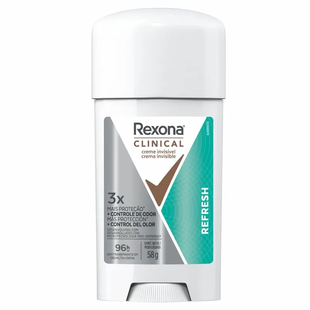 o desodorante Antitranspirante Rexona Clinical Creme Invisí,vel Refresh 58g Foi Desenvolvido Para Quem Busca Má,xima Proteç,ã,o Contra Suor E Odor, Garantindo Até, 96 Horas De Eficá,cia. Sua Fó,rmula Exclusiva Conta Com A microtecnologia Pro-defense&trade,, Que Age Diretamente Nas Glâ,ndulas Sudorí,paras, Proporcionando 3 Vezes Mais Proteç,ã,o Do Que Um Antitranspirante Comum. Com Textura Em Creme, é, Fá,cil De Aplicar, Nã,o Deixa Manchas E Manté,m Uma Sensaç,ã,o De Frescor Prolongada Ao Longo Do Dia.