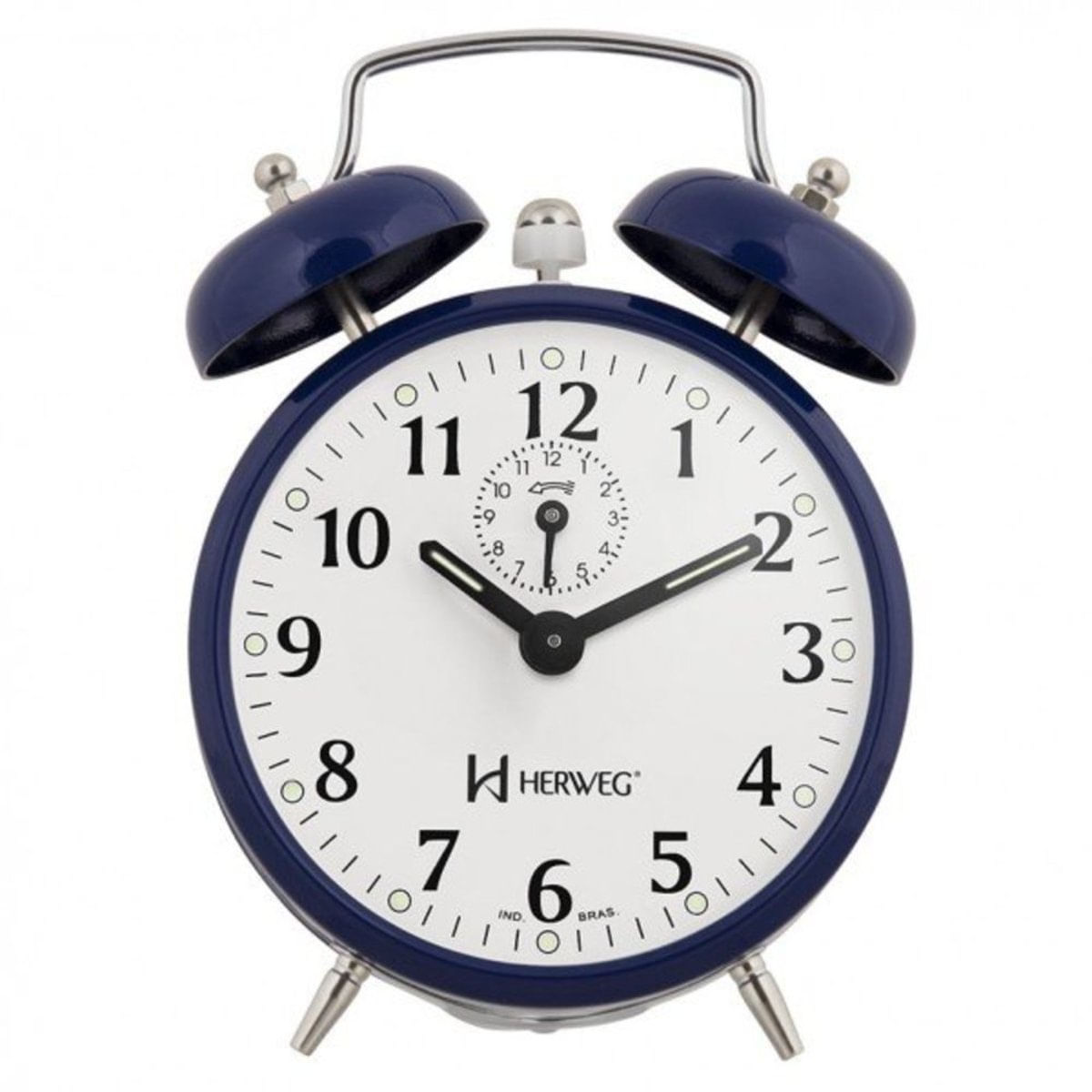 Despertador Mecânico Herweg Ref: 2208-011 Relógio Despertador Mecânico Cor:Azul Base em Metal Pintado Visor de acrílico Ponteiro com massa luminosa Mostrador com massa luminosa Botões de regulagem na parte traseira e na parte superior do produto Detalhes cromados Medidas: Altura 14 cm Largura 9 cm Espessura 6 cm Manual de Instruções Certificado de Garantia: 12 meses