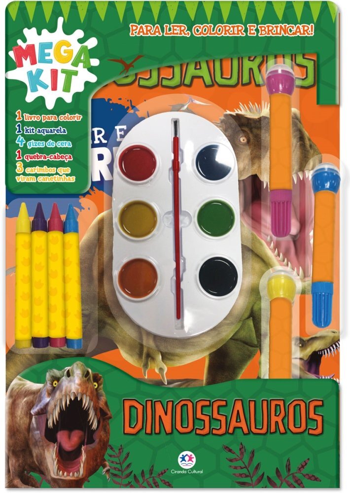 Prepare-se Para Muita Aventura Com Incríveis Dinossauros! Divirta-se Com Um Livro Para Ler E Colorir, Gizes De Cera, Um Estojo De Aquarela Com Seis Cores, Canetinhas Com Carimbos Acoplados E Um Quebra-cabeça Para Recortar E Brincar!