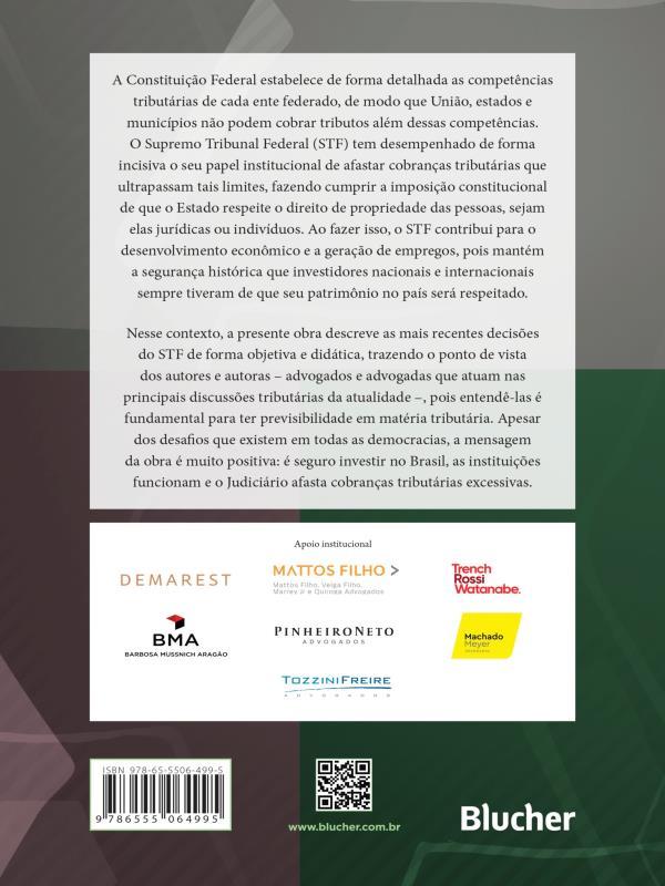 nesse Contexto, A Presente Obra Descreve As Mais Recentes Decisões Do Stf De Forma Objetiva E Didática, Trazendo O Ponto De Vista Dos Autores E Autoras – Advogados E Advogadas Que Atuam Nas Principais Discussões Tributárias Da Atualidade –, Pois Entendê-las É Fundamental Para Ter Previsibilidade Em Matéria Tributária. Apesar Dos Desafios Que Existem Em Todas As Democracias, A Mensagem Da Obra É Muito Positiva: É Seguro Investir No Brasil, As Instituições Funcionam E O Judiciário Afasta Cobranças Tributárias Excessivas.
