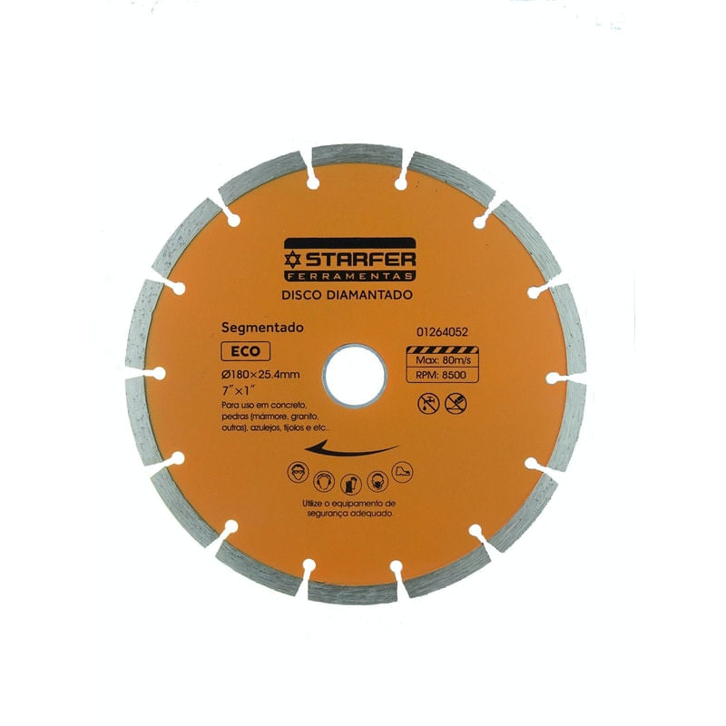 Disco diamantado segmentado STARFER ECO Proporciona cortes com menor atrito, pois as gargantas eliminam o contato contínuo entre abanda de corte e o material, ajudando a refrigerar ambos - Pode ser usado para corte a seco sem risco de superaquecimento. Aplicações em cortes de concretos, rebocos, tijolos, refratários e basalto e asfalto....Ref.:01264052.Marca.: Starfer