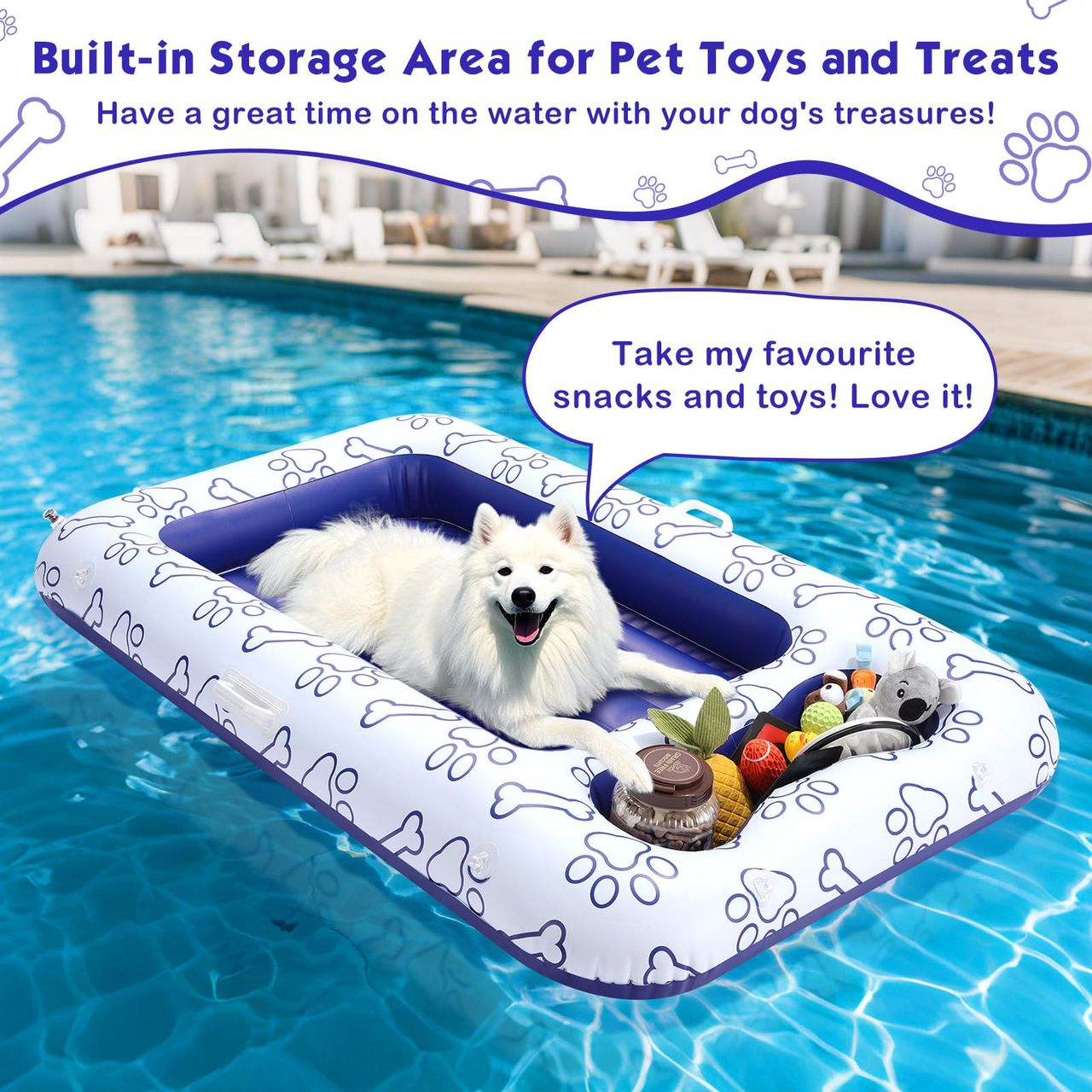 - O Animal De Estimação Adora: Com Área De Armazenamento Embutida Para Brinquedos E Alimentos Na Piscina Para Cães, Os Animais De Estimação Podem Brincar Com Brinquedos E Saborear Lanches Saborosos Mesmo Na Água. Com Estampas Fofas De Pata De Cachorro E Cores Frescas, Seus Amigos Peludos Vão Adorar Esta Boia De Cachorro Projetada Apenas Para Eles.