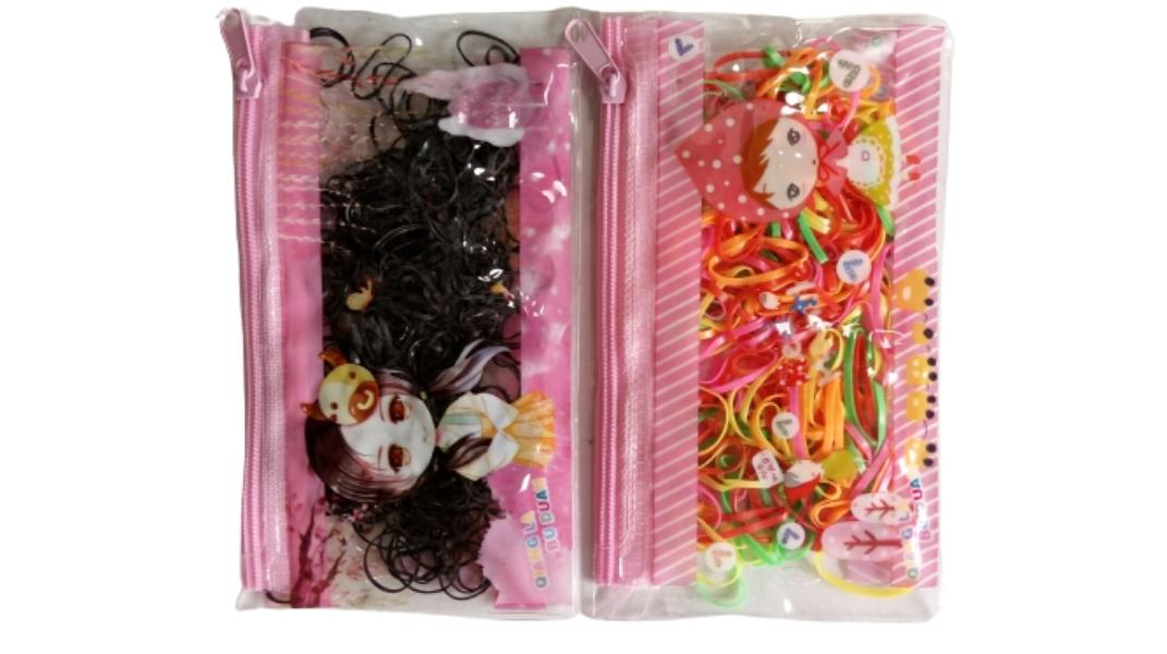 Liguinha de cabelo em silicone,kit com 2 bolsinhas sendo: 2 bolsinha com 300 liguinhas pretas em cada,diâmetro de 1,5 cm 2 bolsinha com 160 liguinhas coloridas em cada,diâmetro de 2,3 cm Ao todo são mais de 900 peças Bolsinha plástica com ziper A quantidade pode variar levemente