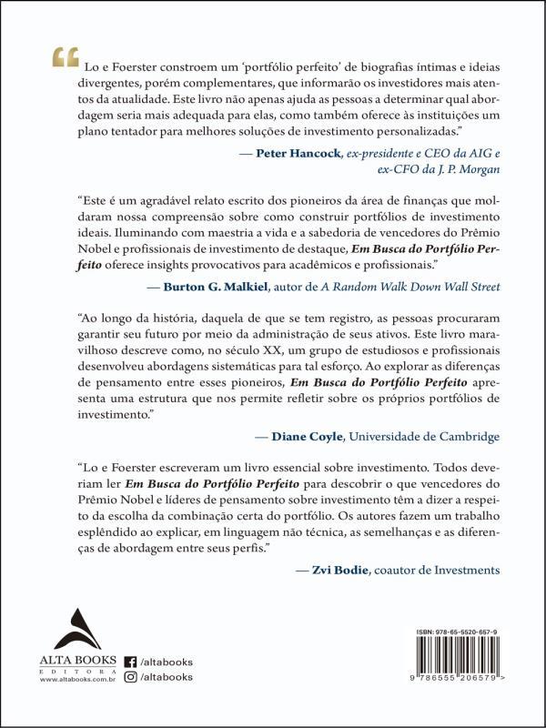 “lo E Foerster Escreveram Um Livro Essencial Sobre Investimento. Todos Deveriam Ler Em Busca Do Portfólio Perfeito Para Descobrir O Que Vencedores Do Prêmio Nobel E Líderes De Pensamento Sobre Investimento Têm A Dizer A Respeito Da Escolha Da Combinação Certa Do Portfólio. Os Autores Fazem Um Trabalho Esplêndido Ao Explicar, Em Linguagem Não Técnica, As Semelhanças E As Diferenças De Abordagem Entre Seus Perfis.” — Zvi Bodie, Coautor De Investments
