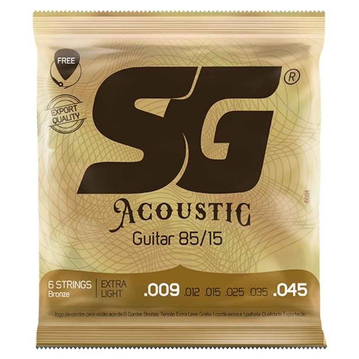 Cordas para violão de 6 cordas:..Marca: Sound Generation..Modelo: SG6684..Material: Bronze 85/15..Tipo: Tensão extra leve..Espessuras das cordas: 009 - 012 - 015 - 025 - 035 - 045 ..Origem: Nacional. . corda (mi) extra e 1 palheta