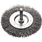 Escola Circular Arame Ondulado com Haste 3x1/4'' Tramontina PRO .....A linha de escovas da Tramontina PRO é utilizada para fazer a remoção de rebarbas, ferrugens, pinturas, carepas e respingos de solda, proporcionando acabamento em aços, madeiras, tubos e borrachas...Orientações.Corpo em chapa de aço especial.Filamentos em aço especial temperados.Diâmetro do filamento de 0,3 mm.Diâmetro da haste 6 mm.EN 1083.Utilizadas nas aplicações de remoção de rebarbas, ferrugem e pintura de nível leve em aços, madeira e borracha.Utilizadas com furadeiras e retificas retas com rotação até 4500 rpm.As ferramentas são submetidas a testes de aplicação prática para garantir sua resistência mecânica em uso intenso. As ferramentas são produzidas e testadas conforme normas específicas..Observações.Use óculos, luvas e outros equipamentos de proteção de acordo com a tarefa a ser executada. Armazene as escovas em local protegido de umidade, condensação, chuva, água, ácido ou outros líquidos agressivos e vapores que possam causar oxidação nos filamentos e partes metálicas das escovas. Tenha cuidado com a ponta dos arames, pois eles podem ferir o usuário. Nunca use escovas que apresentem defeitos. Não altere as características da escova. Use as escovas somente nas máquinas recomendadas. Nunca ultrapasse a rotação máxima da escova. Sempre que possível coloque o corpo de modo a evitar ser atingido pelas partículas projetadas durante a escovação. Não use roupas largas. O cabelo longo deve ser protegido por uma rede e capacete. Evite pressão excessiva da escova na peça. O excesso de pressão reduz a eficiência da escova e pode provocar avarias na máquina. Proteja as mãos de todas as partes rotativas durante o processo de escovação. Armazene em local limpo e seco..Características Gerais....EAN13.7891114158335...DUN14.17891114158332...NCM.9603.50.00...Peso Líquido.0,0700 kg....Peso Bruto.0,1000 kg....Metragem.0,000088 m³....Dimensões Embalagem (Compr. X Larg. X Alt.).175x 10x 50 mm....Dimensões Produto (Compr. X Larg. X Alt.).75x 9x 34 mm....Dimensão Extra A.75,0 mm....Dimensão Extra B.9,0 mm....Dimensão Extra C.34,0 mm......Características Gerais do Produto: