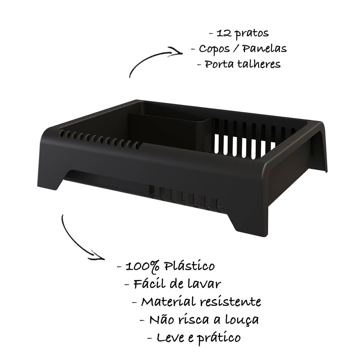 Características Gerais Do Produto: Características: Capacidade Para 12 Pratos - Espaço Para Talheres E Copos Cor: Branco, Preto, Vermelho, Cinza, Areia Itens Inclusos: Escorredor De Louça Medidas: 46 X 36 X 11 Cm Fabricante: Stolf Material: Plástico Polipropileno