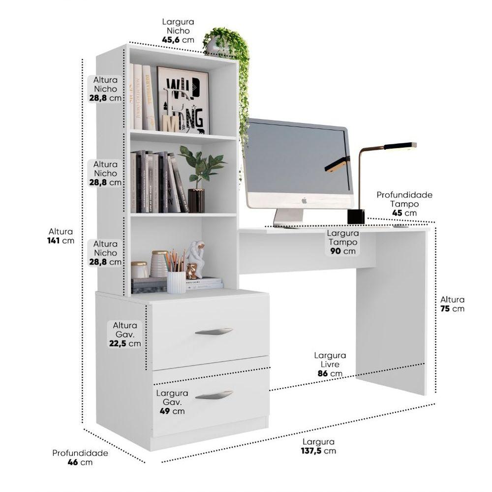 Escrivaninha Com 2 Prateleiras E 2 Gavetas Compacto Ônixa Escrivaninha Ônix É A Escolha Ideal Para Quem Busca Otimizar Ambientes Com Organização, Praticidade E Muito Estilo. Com Montagem Flexível, Pode Ser Montada Com A Prateleira Em Ambos Os Lados, Adaptando-se Perfeitamente Ao Seu Espaço.características:- Montagem Flexível: Instale As Prateleiras No Lado Que Preferir.- Material De Qualidade: Estrutura Em Mdp 12mm, Tampo Reforçado Em Mdp 15mm.- Gavetas Funcionais: 2 Gavetas Espaçosas Com Corrediças Metálicas, Suportando Até 2kg Cada.- Prateleiras Práticas: 2 Prateleiras Para Livros, Objetos Decorativos E Materiais De Trabalho, Suportando Até 2kg Cada.- Puxadores Resistentes: Em Plástico De Alta Durabilidade.- Sapatas Niveladoras: Garante Estabilidade Em Qualquer Superfície.- Capacidade: Tampo Suporta Até 10kg Distribuídos.dimensões:- Altura Total: 141 Cm- Largura Total: 137,5 Cm- Profundidade Total: 46 Cm- Largura Do Tampo: 90 Cm- Profundidade Do Tampo: 45 Cm- Altura De Cada Nicho: 28,8 Cm- Largura De Cada Nicho: 45,6 Cmmontagem:- Complexidade Média. Recomenda-se A Montagem Por Duas Pessoas Ou Por Alguém Com Conhecimentos Básicos De Montagem De Móveis.cuidados:- Limpe Utilizando Apenas Flanela Ou Pano Seco. Não Utilize Produtos Químicos Ou Abrasivos Para Garantir A Durabilidade Do Móvel.transforme Seu Ambiente De Trabalho Ou Estudo Com A Escrivaninha Ônix Mais Organização, Conforto E Estilo No Seu Dia A Dia!