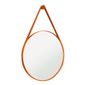 Espelho de Parede Modelo Adnet com formato redondo e 60 cm de diâmetro. A estrutura é composta por vidro e revestimento em corino na cor caramelo. O design inclui alça para sustentação e pino de suporte para fixação na parede. O produto é indicado para instalação em ambientes internos como banheiros, corredores, quartos e salas de estar. O conjunto possui peso aproximado de 2 Kg e acompanha os acessórios necessários para a montagem.
