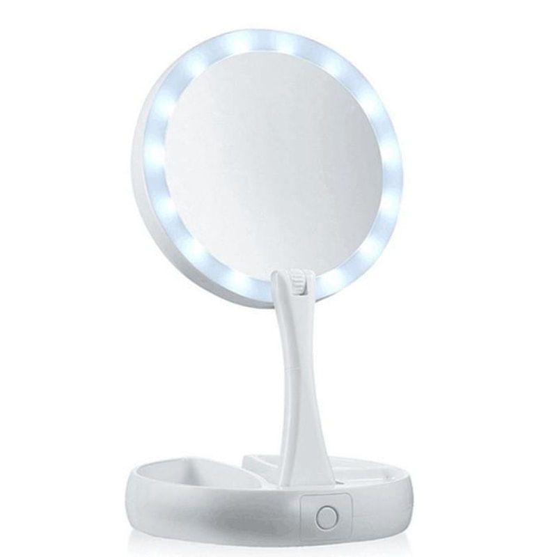 Quando já estiver fora de casa este espelho é ideal para você fazer sua maquiagem no camarim, carro, ambientes que possam não ter muita iluminação, quarto, sala ou na sua casa. ..My Foldaway Mirror é um espelho de vaidade iluminado e de dois lados. ..Tem uma poderosa ampliação de 10x. Dobra e gira para fácil utilização e armazenamento. ..O LED super brilhante acende-se em ambos os lados para iluminação perfeita da imagem. ..É feito de vidro isento de distorção. ..Este espelho 1x gira para um poderoso espelho de ampliação de 10x. ..Possui um organizador embutido para acessórios. ..É leve e compacto para viagens. ..O espelho é nítido, limpo e livre de distorção. ..- lâmpada de espelho dupla face: espelho com ampliação de 10x no espelho traseiro e 1x na espelho frontal podendo girar ao contrario...- luzes super brilhantes na parte dianteira e traseira..- dobras planas para armazenamento e transporte..- Espelho com funcionamento a base de 4 pilhas AA (NÃO INCLUSAS) ..- 3 compartilhamentos na base para guardar acessórios de maquiagem..- Botão Liga/Desliga na parte de trás da base..Conteúdo da embalagem:.1- Espelho com base..Dimensões:.- Altura do espelho articulado c/ base: extensão maxima de 28 cm..- Diâmetro da base: 15 cm..- Altura da base: 2,5 cm