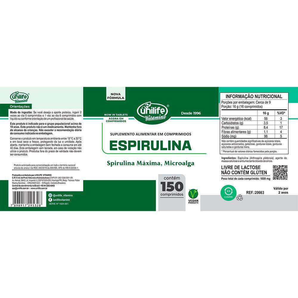 Espirulina Unilife 150 Comprimidos 1000mgespirulina Unilife 150 Comprimidos 1000mgmodo De Ingestão:se Você Deseja O Aporte Proteico, Ingerir 2 Vezes Ao Dia 5 Comprimidos E 1 Vez Ao Dia 6 Comprimidos Com Líquido Ou Conforme Orientação De Um Profissional Da Saúde.este Produto É Indicado Para O Grupo Populacional Acima De 19 Anos. Este Produto Não É Um Medicamento. Mantenha Fora Do Alcance De Crianças. Não Exceder A Recomendação Diária De Consumo Indicada Na Embalagem.ingredientes:espirulina (arthrospira Platensis), Agente De Massa Celulose E Antiumectante Dióxido De Silício.peso Total De Cada Comprimido: 1000mg.não Contém Glúten.livre De Lactose.produto Vegano.produto Autorizado Para Comercialização Em Todo O Território Nacional Através Do Anexo I Da Rdc 240/2018 Da Anvisa. Afe Do Ms 6.02234-1.