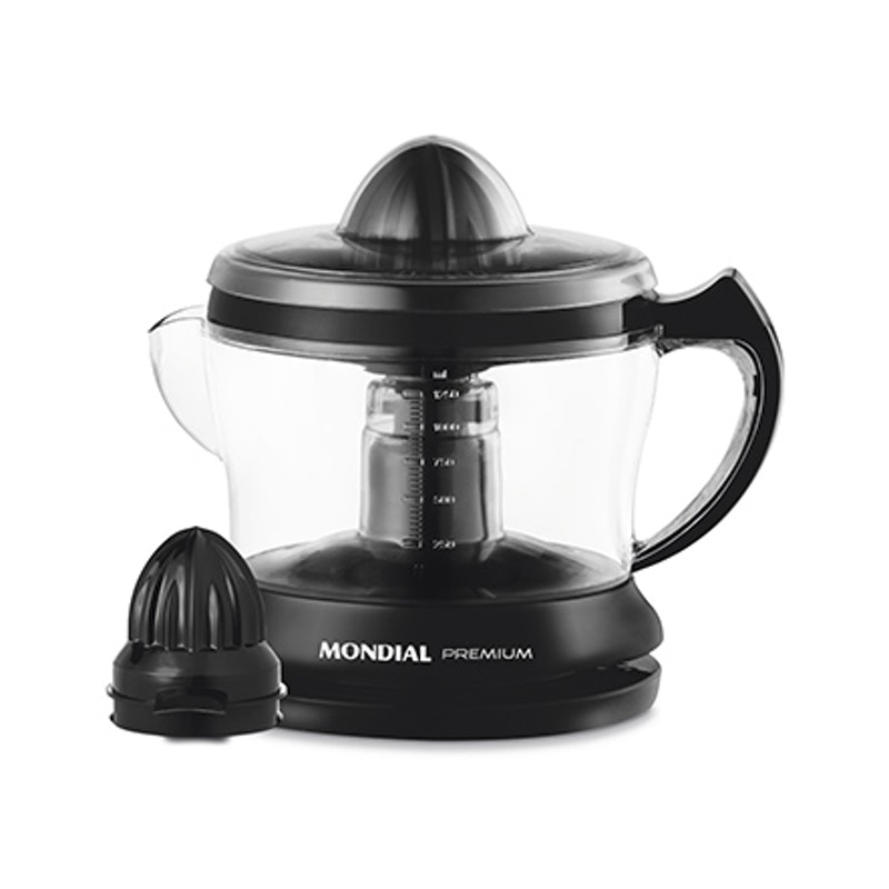 Espremedor de Frutas Mondial Premium E-02..Com alto padrão de eficiência e qualidade, o Espremedor de Frutas .Premium da Mondial faz deliciosos sucos. Recomendado para a extração .de sucos de frutas cítricas como laranjas e limões, o E-02 tem 30 W de potência, .2 cones para extração, um para laranja e outro para limão, e jarra com .capacidade para 1,25 L. Seu acionamento é automático, ou seja, funciona .com a pressão do cone, e o motor reversível opera nos dois sentidos .para facilitar a extração...Características:..Jarra removível sim.Motor c/ dupla rotação sim.Acessórios - 2 cones.Design e cor arrojadas .Cone para extração de suco de limão .Porta-fio .Acionamento automático..Especificações Técnicas:..Capacidade da jarra 1,25 L.Cor preto.Potência (W) 30.Tensão/Voltagem 110V..Conteúdo da Embalagem:..1 Espremedor de Frutas Mondial Premium E-02..Garantia 12 meses..Dimensões:..Altura 22,00 Centimetros.Largura 24,00 Centimetros.Profundidade 16,00 Centimetros.Peso 6,80 Quilos