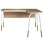 A estrutura elegante é suportada pelos pés em tubo de aço com extremidades em madeira, uma fusão de estilo industrial e orgânico. Os tubos de aço contam com acabamento dos pés em pintura branca, que se alinha à estética clean do conjunto.