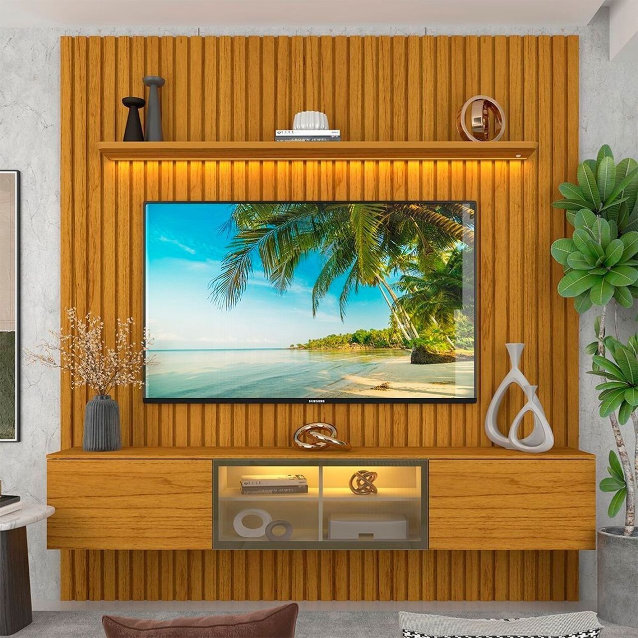 O Conjunto Painel Nobre Nicho Luminare É Sinônimo De Elegância E Funcionalidade. Produzido Em Mdf Ripado Autêntico, Traz Prateleira Com Led Em Cor Quente, Nicho Com Porta Em Vidro Reflecta E Abertura “push To Open”, Além De Dobradiças Slow Motion Que Oferecem Suavidade No Uso. Um Móvel Moderno, Resistente E Sofisticado Para Valorizar Sua Sala.
