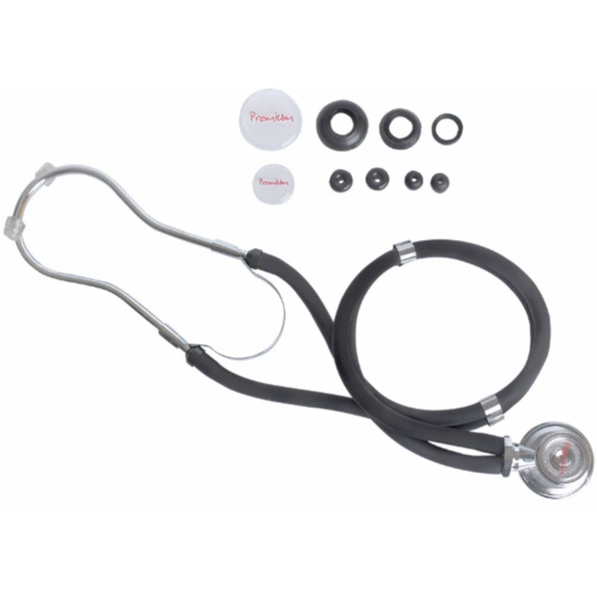 Estetoscópio Duplo Rappaport Premium Preto.O Estetoscópio Rappaport Premium é indicado para a ausculta cárdio-respiratória não invasiva do organismo. Ele é completo, com tubo duplo para ausculta mais precisa e inclui olivas e diafragmas para conversão em diferentes formas de uso. É um aparelho de uso médico que requer treinamento e prática para o uso correto..Adulto e Pediátrico.Inclui Olivas e Diafragmas para conversão em diferentes formas de uso.Tubo Duplo para ausculta mais precisa.Produzido com os materiais mais nobres.Material: Aço Cromado / Látex.Marca: Premium.Modelo: Rappaport.Conteúdo da embalagem:.Par de Oliva rosqueável dura.Par de Oliva rosqueável macia.Par de Oliva rosqueável silicone.2 pares de membranas de plástico rígido.Anel rosqueado de cobre cromado (Infantil, Adulto).Base rosqueada de cobre cromado que possibilita troca do sino ou diafragma (Infantil, Adulto).Câmara de som em liga de alumínio (oxidado ou anodizado).Tubo duplo de PVC ligado através de anéis metálicos.Fone biauricular de cobre cromado.Diafragma aberto (sino prolongador) tamanho pequeno.Diafragma aberto (sino prolongador) tamanho médio.Diafragma aberto (sino prolongador) tamanho grande.Auscultador.Manual de Instruções. Dimensões da Embalagem: 5 x 12 x 30 cm..Garantia: 1 ano contra defeitos de fabricação