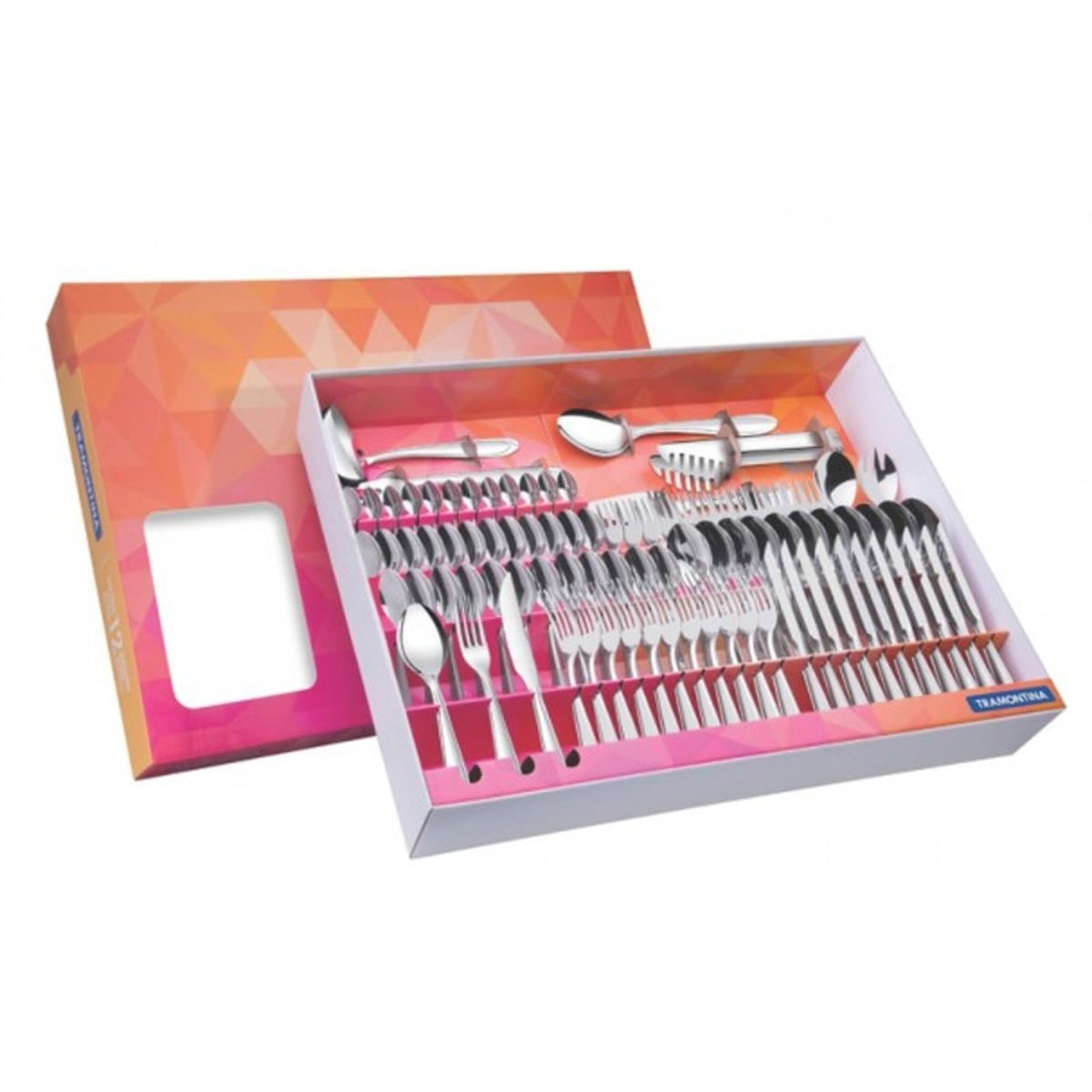 66906/890..Conteúdo..Talheres de aço inox. ...01 un - Pegador para massa.12 un - Colher de mesa.12 un - Garfo de mesa.12 un - Colher para chá.12 un - Colher para café.01 un - Colher para arroz.02 un - Talheres para salada.12 un - Garfo para torta.01 un - Pá para bolo.12 un - Faca para churrasco.01 un - Concha para feijão.12 un - Colher média.01 un - Garfo trinchante.Orientações Gerais..Use apenas sabão ou detergente e uma esponja macia. Outros tipos de produtos, como palha de aço, poderão riscar ou prejudicar o brilho dos talheres. .Enxágue bem cada peça a fim de remover totalmente os resíduos dos produtos de limpeza, que, por serem abrasivos, podem atacar o inox. .Sempre que possível, use água quente, pois renova o brilho do talher. .Após a lavagem, enxugue imediatamente os talheres, caso contrário, as substâncias químicas da água (cloro) poderão causar manchas. .Evite atrito entre os talheres durante o processo de lavagem e no armazenamento, para mantê-los sem riscos. .Evite o contato das peças com superfícies quentes. Elas provocam a descoloração do produto. .Não guarde os talheres em locais úmidos. A umidade também provoca manchas..Qualquer faca, independentemente de marca, para manter o fio de corte, é fabricada em aço com maior teor de carbono e, por isso, é menos resistente à corrosão. Assim, pedimos uma atenção especial para este artigo, pois estará mais propenso aos problemas citados. ..Usando máquina de lavar louças ..Não carregue em demasia a cesta dos talheres. Separe bem as peças, pois o contato permanente entre as mesmas, durante a secagem, poderá causar manchas. .Retire os talheres logo que tenha terminado o ciclo"enxaguar", a fim de que os mesmos sejam secados manualmente...Benefícios do Produto..1. As peças são acondicionadas em uma bela embalagem. .2. Totalmente feitas de aço inox, altamente duráveis, mantêm suas características originais, preservando a beleza, a higiene e a durabilidade do material. .3. Colheres com bojo em formato simétrico ebordas cuidadosamente arredondadas. .4. Garfos com dentes polidos na parte interna, com formato apropriado para a boca e bordas arredondadas para proporcionar maior conforto no uso. .5. Facas totalmente temperadas, que garantem maior durabilidade no fio de corte e maior resistência à corrosão, e por suas características de temperabilidade, não riscam as porcelanas. .6. Acabamento em alto brilho. .7. Serviço para 12 pessoas. .8. Podem ser lavadas diariamente na máquina de lavar louças.
