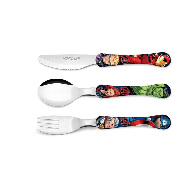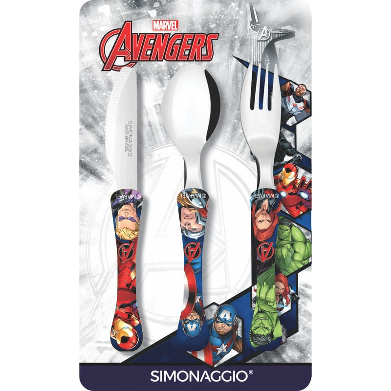 Faqueiro com 3 peças com o tema Vingadores - Avengers.Linha Tematica.Composto por:.1 colher de mesa.1 garfo de mesa.1 Facas de carne (com serrilha). .Material: Aço inox e plastico.Faqueiro autorizado pela MarVel, não é pirataria. cor:Faqueiro quantidade:3 Entidade:Faqueiro marca:Simonaggio