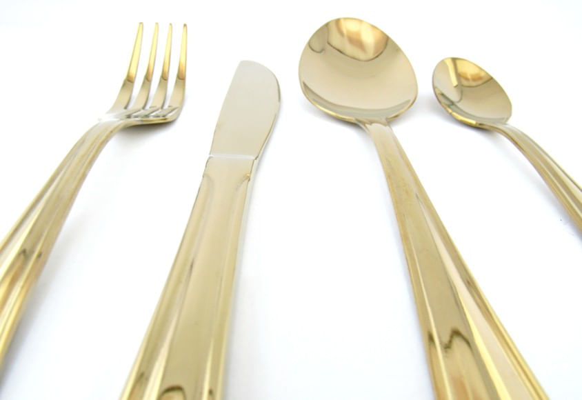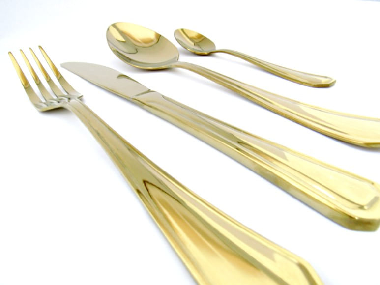 Conjunto: 24 Peças Material: Aço Inox Revestimento: Nitreto De Titânio Dourado Descrição: 6 Garfos De Mesa 6 Facas De Mesa 6 Colheres De Mesa 6 Colheres De Chá