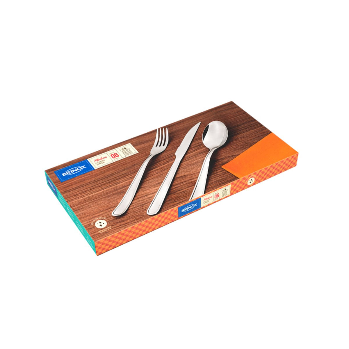 Faqueiro Módena 24 Peças 5119/102 Brinox Receba seus convidados com estilo e sofisticação. O faqueiro da linha Módena possui talheres com um design simples e versátil, capazes de se adaptar às reuniões mais formais e também aos momentos mais descontraídos. Os cabos arredondados facilitam o manuseio, e possuem um friso que confere um ar de sofisticação às peças. A linha de talheres Módena é feita de aço inoxidável, aliando qualidade, resistência e alta durabilidade. O conjunto vem com 06 garfos de mesa de 196x1,2mm, 06 facas de churrasco de 216x2,5mm, 06 colheres de mesa de 196x1,2mm e 06 colheres de chá de 120x0,8mm.Principais CaracterísticasAMBIENTE: CozinhaMATERIAL: Aço InoxLINHA: MódenaTIPO DE PRODUTO: Talheres e FaqueirosCOMPOSIÇÃO: 06 Colheres de Mesa06 Garfos de Mesa06 Facas de Mesa06 Colheres de CháDados TécnicosDimensões Aproximadas do Produto com Embalagem (cm) LxAxC: 23x4x46Peso (kg): 0,906