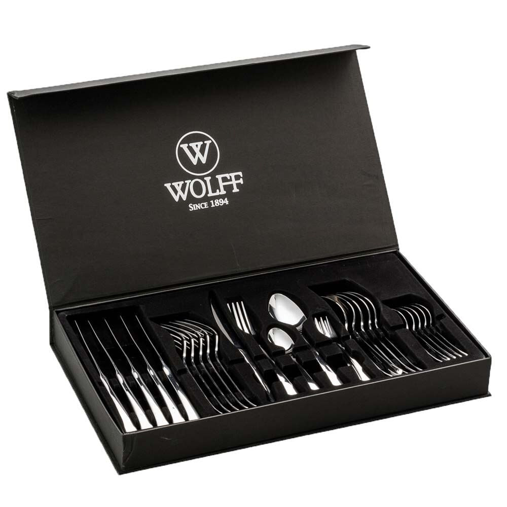 O Faqueiro Wolff Berna São Ideais Para Servir Suas Refeições Com Um Toque Especial E Elegante. Ele Conta Com 30 Peças Feitas Em Aço Inoxidável Resistente, Duradouro E Higiênico. Serve Até Seis Pessoas E Conta Com Um Design Requintado Com Cantos Lisos E Acabamento Em Alto Brilho Que Tornam A Ocasião Ainda Mais Requintada.