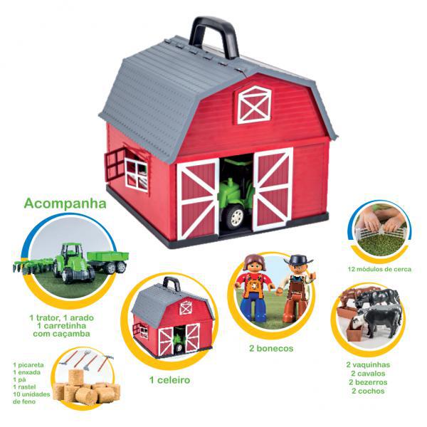 1 Celeiro, 2 Bonecos Fazendeiros, 1 Trator, 1 Arado, 1 Carretinha, 4 Ferramentas Manuais, 2 Vaquinhas, 2 Cavalos, 2 Bezerros, 2 Cochos, 12 Módulos De Cerca E 10 Rolos De Feno.
