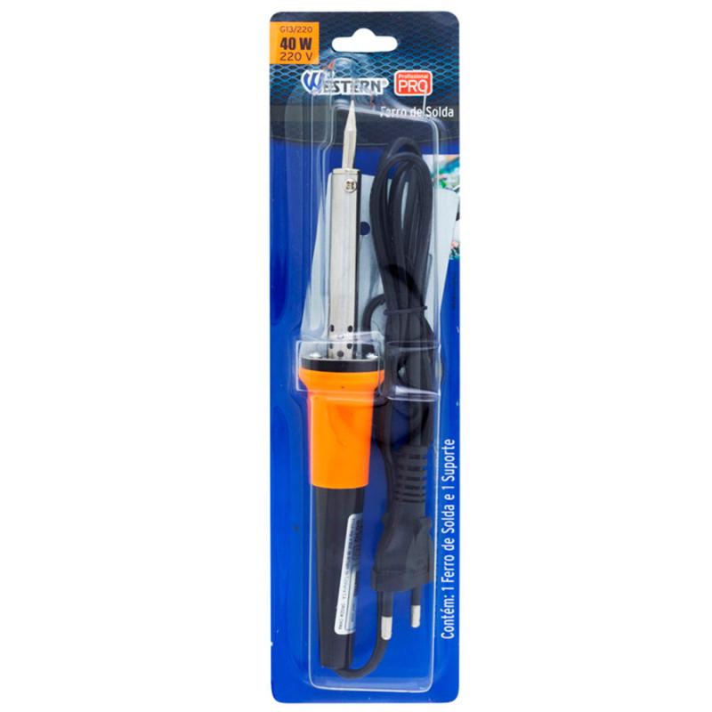 Ferro de Solda 40 Watts G13 WESTERNFerro de solda Western PRO® é indicado para soldagem de componentes eletrônicos e de outros pequenos reparos.Com rápido aquecimento e manutenção da temperatura, proporciona maior produtividade na utilização.Dimensões da Peça: 21 x 3,1 x 3,1cmDimensões da Embalagem: 26,5 x 7,5 x 3,2cmMaterial: Baquelite, Silicone, Cobre, AçoPontas: 85% Cobre e 15% Níquel CromoCor: Cabo Laranja com pretoTipo de Embalagem: BlisterContém: 1 ferro de solda e 1 suporte.DADOS TÉCNICOS:Potência: 40 W.Tensão: 127V ou 220V (não é bivolt)Frequência: 60 Hz.Temperatura máxima: 450°C.Certificado e Autorização para uso do Selo de Identificação e Conformidade com a norma Brasileira.CERTIFICADO Nº BRICS -1795/2016-ELE-1*OCP Nº 0098Código de Fábrica: G13/127 / G13220Marca: WesternGarantia: 3 meses* Imagens meramente ilustrativas.