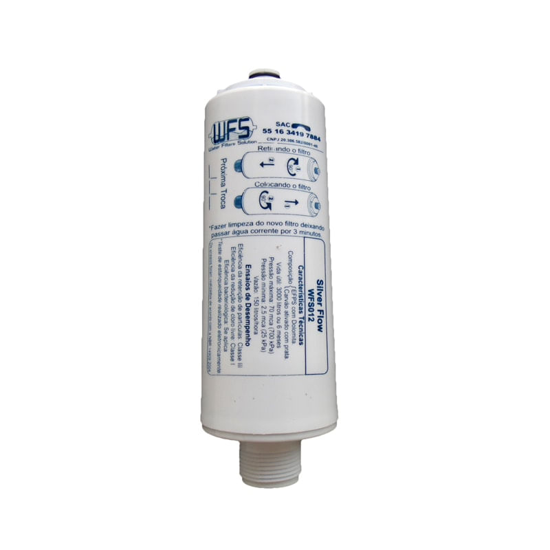 Refil filtro WFS012 - Silver Flow.Refil similar para purificadores Libell..Compatibilidade: Libell Press / Libell Press Side / Libell Press Baby / Libell AcquaFlex ..-Elimina odores.-Elimina sabores desagradáveis.-Retém partículas (barro, areia, ferrugem e sedimentos).-Reduz cloro.-Bacteriostático (controla a proliferação de bactérias).-3 etapas de filtragem.-Produto a ser utilizado com água potável, de acordo com a Portaria MS 2914.-Este produto produzido conforme a Norma ABNT NBR 16.098:2012.-Carvão ativado impregnado com Prata Coloidal - Elemento responsável pela retenção de cloro livre na água.-Polipropileno e Dolomita - Responsáveis pela retenção de partículas sólidas, e por regular o Ph da água.-Plástico de alta resistência com ação bacteriológica..Características Técnicas:..-Vida útil: 3000 litros ou 6 meses.-Pressão de Operação: 25 a 700 kPa.-Vazão: 150 litros/hora.-Retenção de Partículas: Classe III.-Retenção da Redução de Cloro Livre: Classe I.-Eficiência bacteriológica: Se aplica..Como trocar meu filtro:..Libell Acqua Flex:.-Desconectar a tampa superior do Purificador pressionado para cima a aba presente na parte frontal da tampa..-Retirar o filtro girando no sentido anti-horário até que as abas fiquem livres e puxe-o para trás..-Com o filtro já fora do purificador, conecte a mangueira de entrada d'água na rosca 3/4 do filtro e abra o registro de água para que seja feito o esgotamento do filtro. Deixe passar aproximadamente 5 L (litros) de água, até que a água saia cristalina. ..Libell Press, Press Side e Press Baby:.-Conecte a mangueira de entrada de água no refil..-Abra o registro para que se ja feito o esgotamento do elemento filtrante. Deixe passar água, no mínimo 5 Litros, até que a água saia cristalina..-Desconecte a mangueira para instalar o filtro no aparelho..-Conecte o refil ao purificador girando no sentido horário até que fique bem preso..-Retome a mangueira ao purificador.