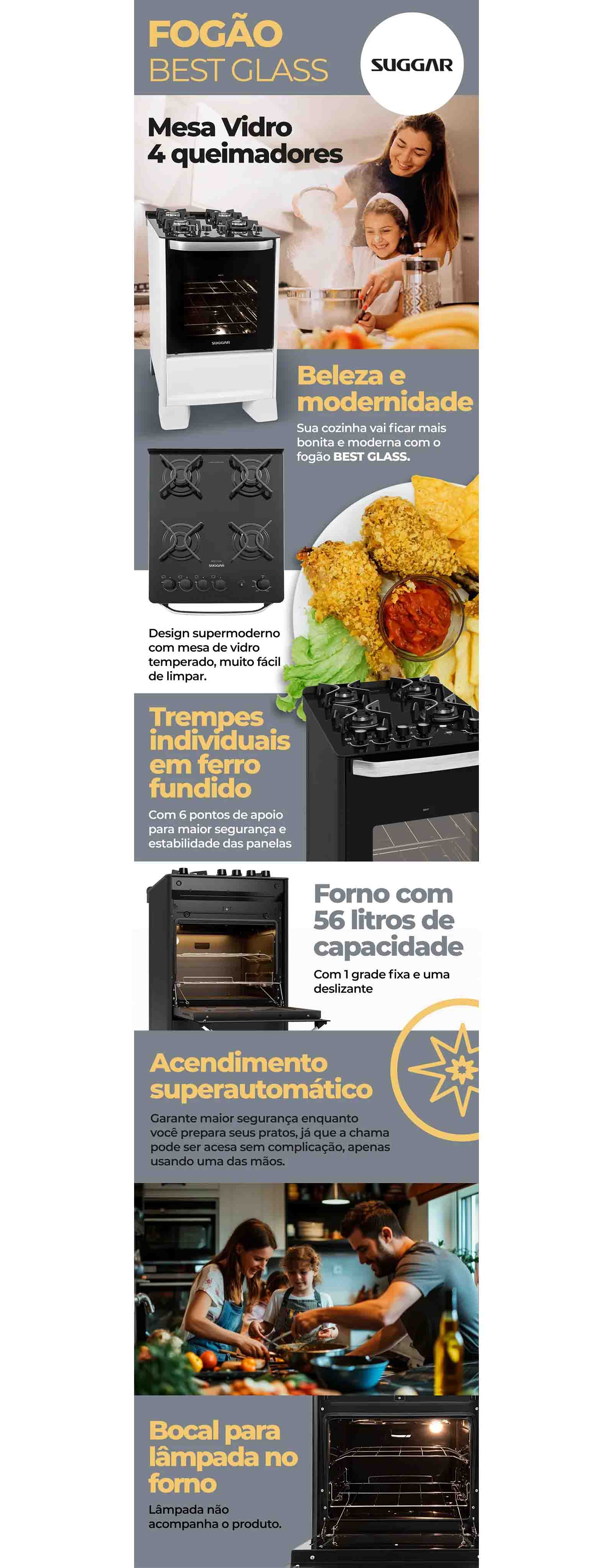fogão Best Glass 4 Queimadores Suggar. Sua Mesa De Vidro Temperado, Além De Dar Um Toque Mais Bonito Na Cozinha, Garante Qualidade E Alta Resistência. Seu Forno Possui Capacidade Para 46 Litros E Conta Com Revestimento Para Facilitar A Limpeza E Simplificar Suas Tarefas Diárias. Para Tornar Mais Simples A Retirada Dos Alimentos Do Forno, Conta Com Uma Grade Auto Deslizante E Outra Deslizante. Suas Trempes Individuais Em Ferro Fundido, Com 6 Pontos De Apoio, São Robustas E Duráveis, Proporcionando Estabilidade E Segurança À Cozinha