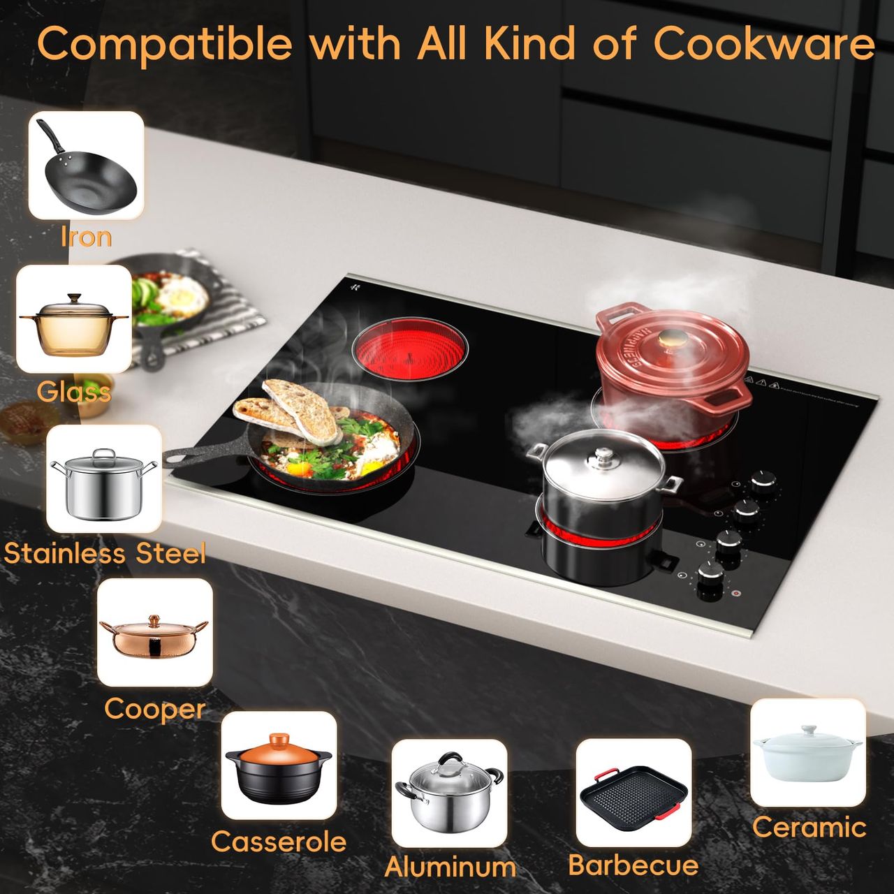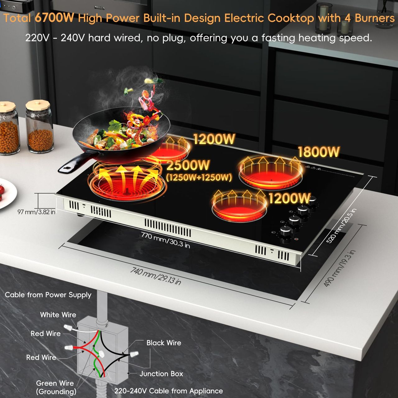 - [zarbaco Electric Cooktop - Potência E Eficiência Combinadas]: Cozinhe Com Confiança E Estilo Com O Fogão Elétrico Zarbaco 4 Bocas De 30 Polegadas, Com Uma Potência Total Potente De 6700 W, Com 11 Níveis De Potência Ajustáveis, Com 4 Queimadores A 1200w + 1250w/2500w (duplo) + 1800w + 1200w Para Calor Intenso E Tarefas Mais Delicadas, Este Fogão Elétrico Garante Um Cozimento Rápido E Eficiente, Perfeito Para Reuniões Familiares Como Aniversários, Natal E Ação De Graças.