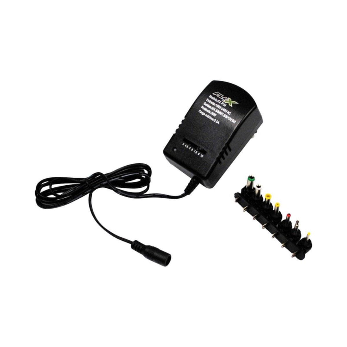 Fonte de Alimentação Chaveada 2.5a Com 7 Conectores - Flex..Fonte de alimentação chaveada 2,5 possui 7 conectores 30w.Saídas: 3/4.5/5/6/7.5/9/12V.Indicado para tablet, roteador, netbook, câmeras digitais, brinquedos e etc...Modelo: FX-FU4.Embalagem: unidade.Altura: 8,5cm.Largura: 6cm.Comprimento: 9,5cm.Peso: 140g..REV 053070