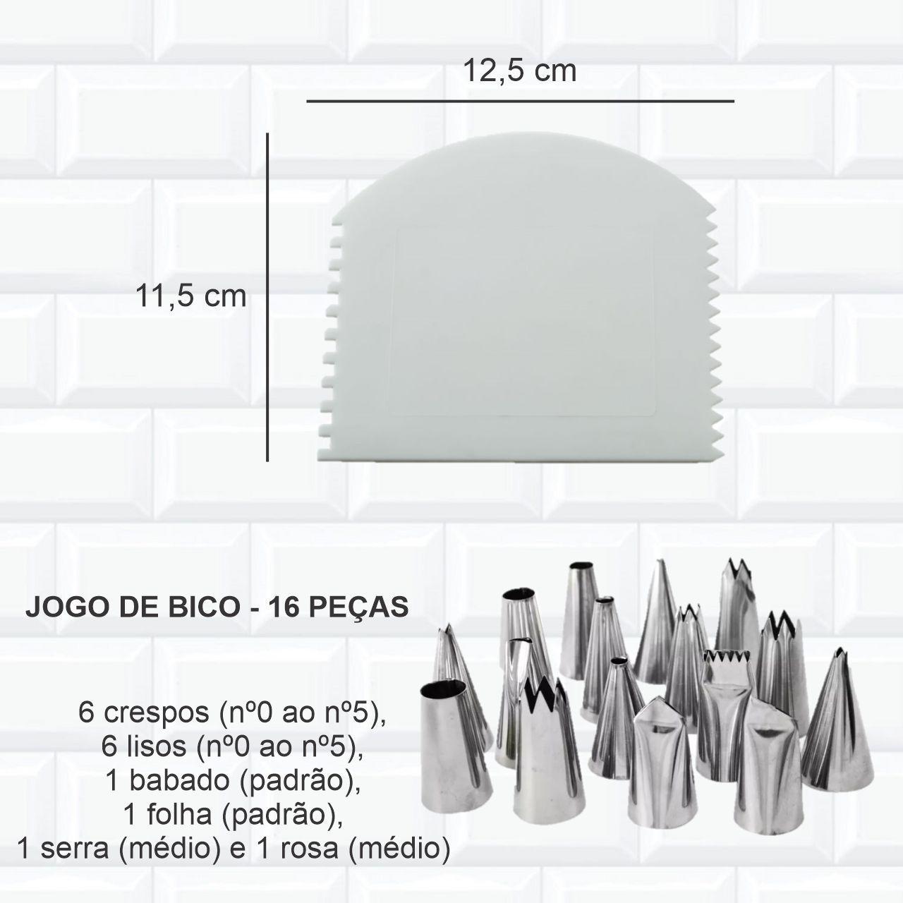 - Jogo De Bico Inox 16 Peças: 6 Crespos (nº0 Ao Nº5), 6 Lisos (nº0 Ao Nº5), 1 Babado (padrão), 1 Folha (padrão), 1 Serra (médio) E 1 Rosa (médio)