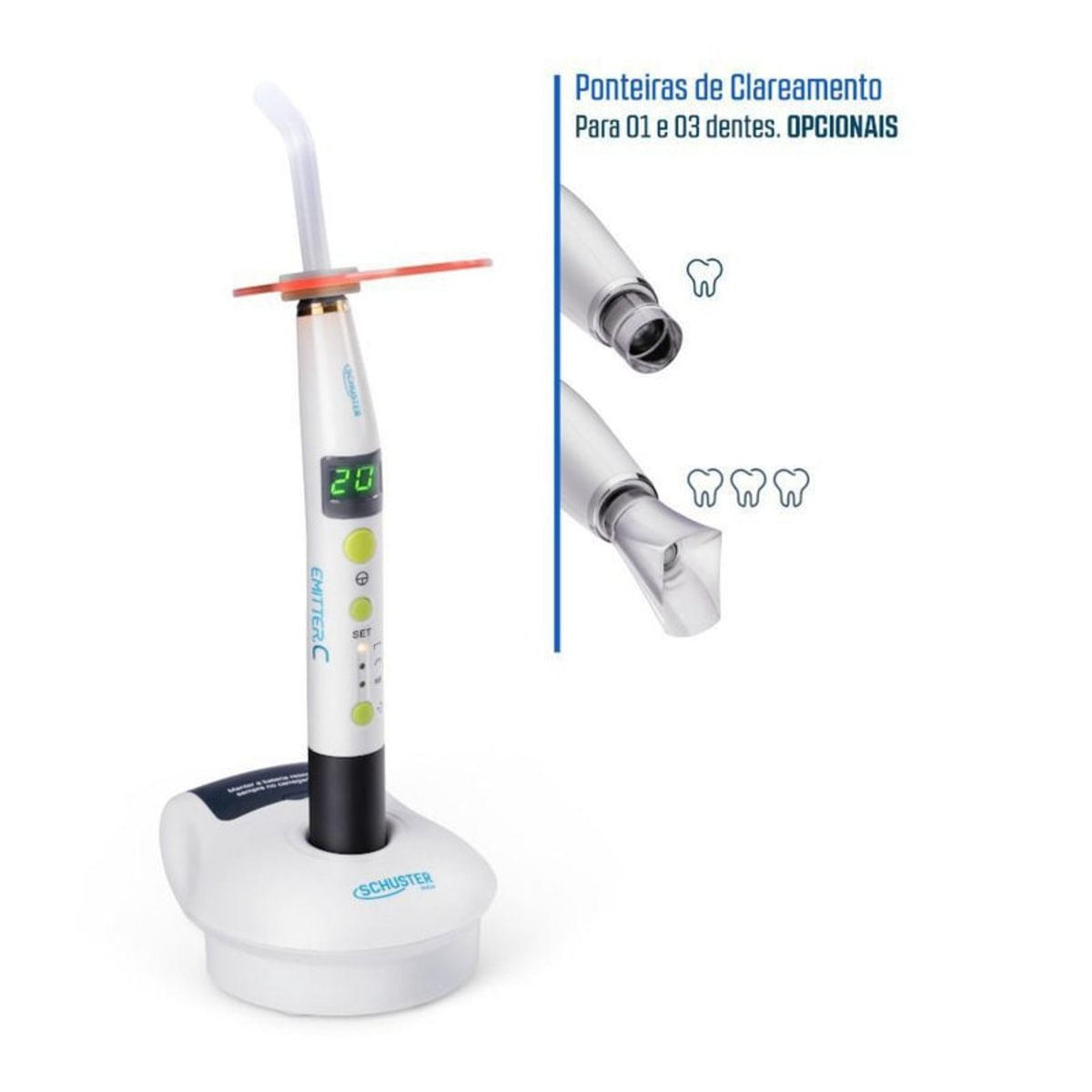 Indicado para:. Restaurações diretas e indiretas.. Colagem de bráquetes e acessórios ortodônticos.. Clareamento dental e fotopolimerização de barreiras gengivais.. Cimentação e adesivação fotopolimerizáveis... Acompanha 2 baterias: O equipamento sempre estará apto para sua utilização, pois não há necessidade de o fotopolimerizador ficar na base para que a bateria seja carregada.. O próprio usuário substitui a bateria de forma simples e rápida.. Wireless (sem fio). Maior praticidade de manuseio.. Luz fria (azul) gerada por LED de alta potência (1250 mW/cm2).. Display digital.. Timer (5, 10, 15 e 20 seg), com bip sonoro no final da operação.. Comandos de programação na própria caneta.. Corpo confeccionado em ABS injetado.. Intensidade de luz constante, independente do nível de carga da bateria. A solidificação (cura) da resina não é afetada pela diferença de carga da bateria.. Tempo de uso contínuo com carga total 120 minutos.. Silencioso, pois não necessita de ventilação forçada.. Bivolt automático 90/240V.. Ponteira de fotopolimerização confeccionada em fibra ótica orientada (sem fuga de luz), autoclavável a 134ºC e com giro de 360º.. Sistema stand by. Desliga automaticamente após 2 minutos sem utilização.. Frequência: 50/60 Hz.. Peso da peça de mão: 0,18 Kg.. Peso Bruto: 0,95 Kg.. Comprimento de onda: 420 à 480 nm.. Emissor de luz: Led (light emiting diode).. Bateria: 3,7 1400 mAh.. Potência de luz: 1250 mW/cm².. 3 Programações de uso:. Contínuo: Potência máxima ao longo de todo o funcionamento.. Rampa: Potência gradual crescente nos primeiros 5 segundos, permanecendo logo após com sua potência máxima.. Pulsado: Luz com potência máxima pulsante com intervalos de 0,2 segundo..Unidade + Ponteira para Clareamento para 01 e 03 Dentes.