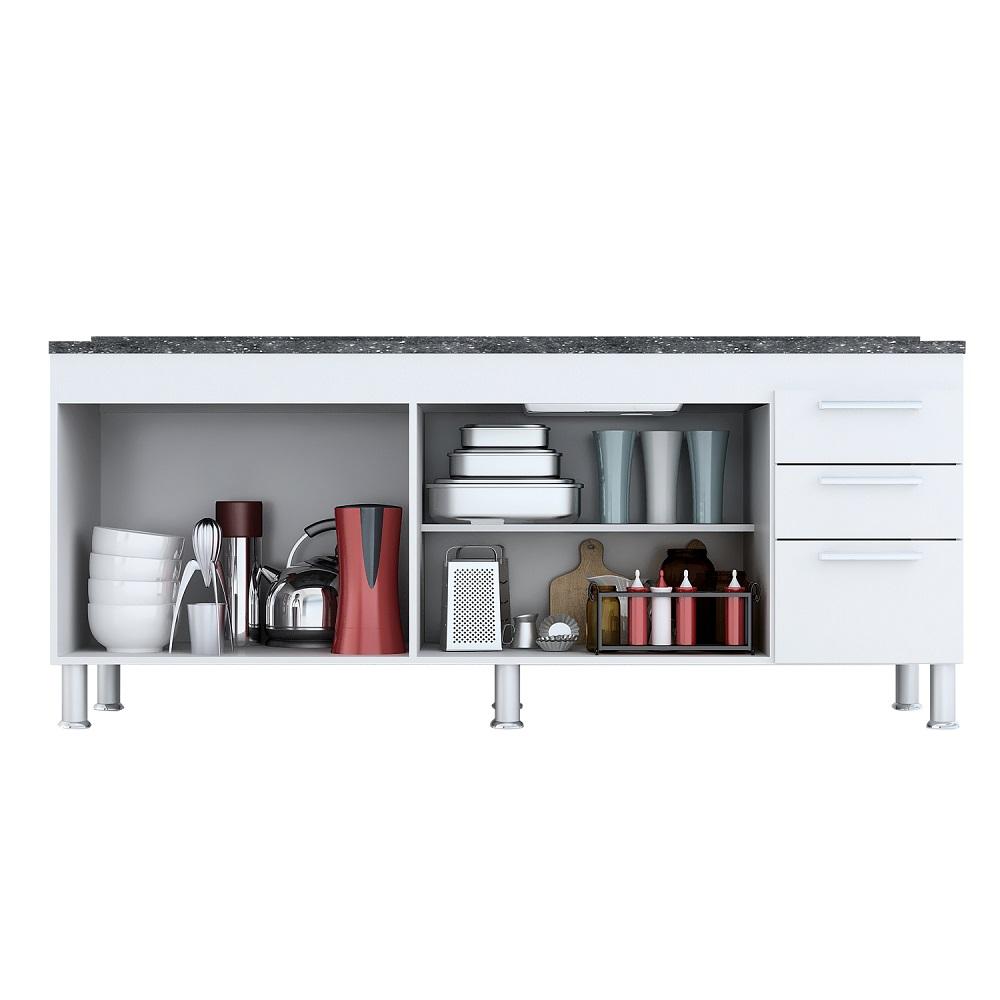 Este gabinete é produzido especialmente para pias de 2m, possui 3 gavetas com corrediças metálicas para melhor armazenar os itens de cozinha e conta com uma prateleira profunda completa no seu interior. Possui puxadores modernos e 5 pés para evitar empenamento da base, o gabinete é totalmente fabricado em MDP de 12mm, aumentando a durabilidade, resistência e qualidade do produto. O gabinete não acompanha o tampo da imagem. Além desses detalhes, possui uma fácil montagem.