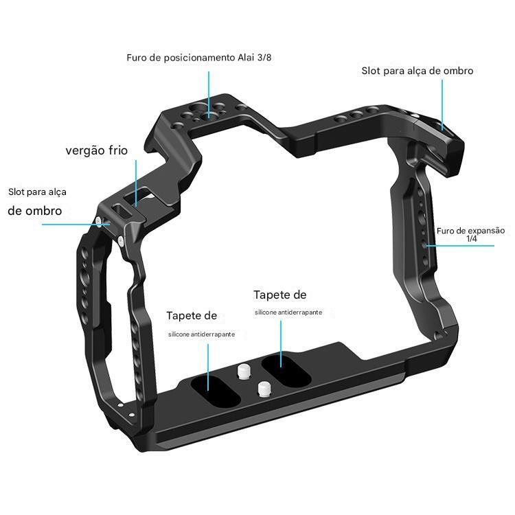 esta gaiola Cage Mamen Bmpcc/6kpro Para Câmera Blackmagic 6k Pro é Uma Estrutura De Proteção Que Oferece montagem De Sapata Fria Na Parte Superior, Múltiplas Roscas De 1/4"-20 (superior E Lateral) Para O Encaixe De Acessórios, Com Furos De Localização Arri, Trilho Nato, Além De Entrada Para Alça Da Câmera E Montagem M4 E M3. A Placa Inferior Apresenta Compatibilidade Com Sistema De Suporte Arca Swiss E Vários Orifícios 1/4"-20 E 3/8"-16 Para Fixação Em Um Tripé Ou Gimbal.