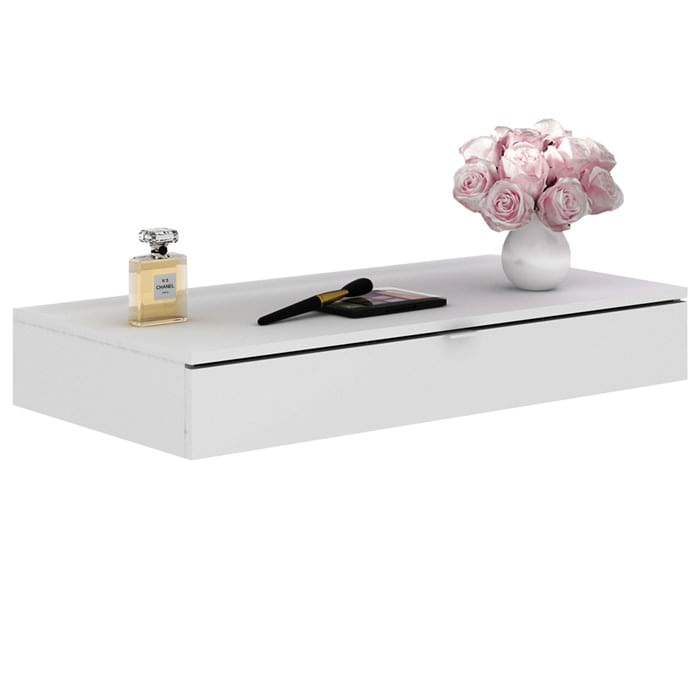 Gaveta Suspensa PE2004, perfeita para você organizar seus itens de maquiagem, perfumes, escovas e acessórios em um só lugar, estrutura resistente em MDP de 15mm, tampo suporta até 8 kg, pintura com acabamento em Uv (Fosco). Gaveta com corrediças telescópicas que deslizam com mais suavidade, suporta até 3 kg, puxador de alumínio escovado, este produto deverá ser fixado na parede, a altura minima ideal para fixar na parede é de 66,2 cm, móvel moderno e funcional, use sua criatividade e utilize como desejar. Este móvel chegará em sua casa separado em 01 volume...Dimensões Gaveta PE2004..Alt 13,8 cm.Larg 90 cm.Prof 45 cm..Sistema de Montagem.Parafusos, buchas, minifix e cavilhas...Recomendação de Limpeza.Limpar com pano seco para retirar o pó. Não aplicar produtos abrasivos...Mural de Espelho Não Incluso..Produtos de Enfeite Não Estão Inclusos.... .Importante saber.As imagens são meramente ilustrativas, não acompanham objetos de decoração e eletrônicos..A tonalidade da cor do produto pode variar de acordo a calibração de cores do seu monitor, a iluminação do ambiente ou sua percepção visual..Ao receber a mercadoria, o cliente deve verificar a quantidade de VOLUMES descritos na nota fiscal, as condições da embalagem, caso haja alguma avaria não assine o comprovante de recebimento..Montagem, desmontagem e outras instalações serão de responsabilidade do cliente..Não nos responsabilizamos, no ato da entrega, por subir escadas/elevadores ou pelo transporte por guincho em apartamentos. Eventuais despesas são de responsabilidade do comprador..Confira as dimensões do produto e certifique-se de que passarão normalmente por supostos elevadores, portas, escadas ou corredores de sua residencia..Entregamos os produtos até a frente de sua moradia, ou seja, até sua porta se for casa ou portaria se for apartamento..O prazo de entrega informado na página do produto e no carrinho é mera previsão, podendo variar dependendo da região, bem como ser alterado após a realização do pedido em razão de fatores externos, tais como a: extravio/roubo/furto/avaria da mercadoria, greves, isolamento social, etc..Entregamos somente em endereços que possuam acesso rodoviário seguro e sem restrições..Nas entregas realizadas por transportadoras, no momento do recebimento o comprador ou a pessoa que receber os produtos DEVE VERIFICAR SE OS PRODUTOS RECEBIDOS correspondem ao mesmo modelo e à mesma quantidade dos produtos adquiridos.. ..Garantia de fábrica.90 dias para eventuais defeitos de fabricação.. .. . .. . ...