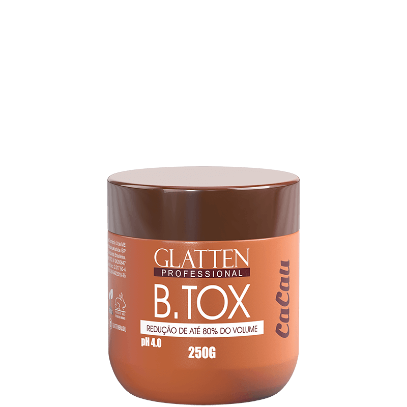Glatten Professional Cacau Therapy - Btox 250g O Complexo Nutritivo Botox Capilar Cacau Glatten foi elaborado com ativos que promovem o realinhamento capilar de alta performance, nutre, rejuvenesce e revitaliza a fibra capilar. Por conter em sua composição ativos hidratantes e alisantes onde juntos proporcionam um liso natural e duradouro, resultando em cabelos restaurados e com brilho esplendido. Modo de UsoLavar os cabelos friccionando bem da raiz as pontas por 3 vezes. Em seguida, secar 80% da umidade do cabelo com o auxílio de uma toalha. Aplicar com os cabelos úmidos e com um auxílio de um pincel, aplique 1cm longe da raiz, utilizando um pente fino leve o produto por toda extensão dos fios enluvando para potencializar o resultado, logo deixe agir no mínimo 20 minutos.Após o tempo de pausa, enxague retirando 80% do excesso do produto. Em seguida escove e pranche em mechas finas. Para um resultado satisfatório, pranche 10 vezes cada mecha. Observações ImportantesCompatibilidade total com qualquer química. Não indicamos este produto para ser aplicado em gestantes, lactantes, crianças e alérgicas, salvo se liberado por um profissional de saúde.Pode ser aplicado em cabelos com henna, henê, relaxamentos, luzes, etc. A lavagem no mesmo dia é opcional. Rende até 6 aplicações.