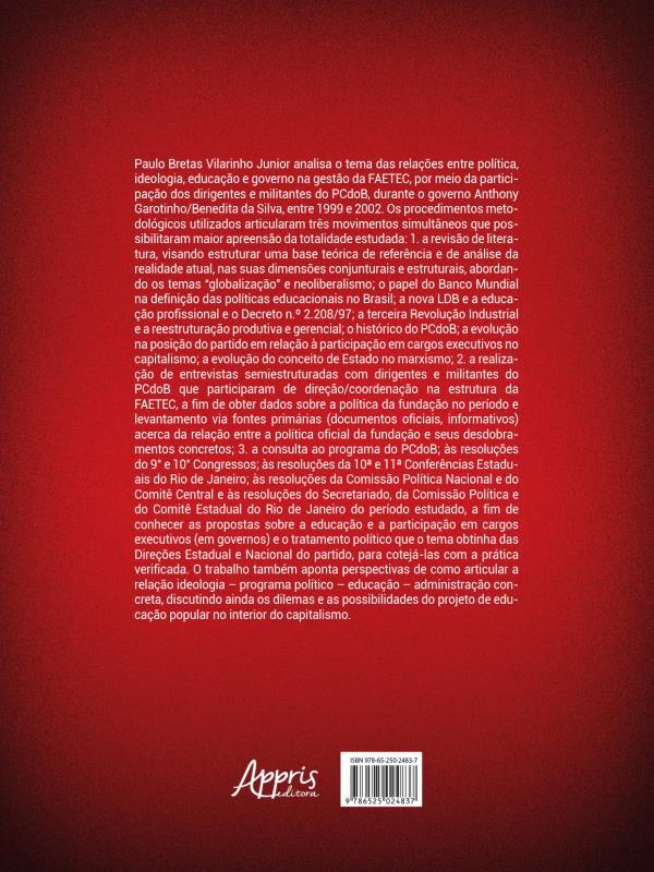 Paulo Bretas Vilarinho Junior Analisa O Tema Das Relações Entre Política, Ideologia, Educação E Governo Na Gestão Da Faetec, Por Meio Da Participação Dos Dirigentes E Militantes Do Pcdob, Durante O Governo Anthony Garotinho/benedita Da Silva, Entre 1999 E 2002. Os Procedimentos Metodológicos Utilizados Articularam Três Movimentos Simultâneos Que Possibilitaram Maior Apreensão Da Totalidade Estudada: 1. A Revisão De Literatura, Visando Estruturar Uma Base Teórica De Referência E De Análise Da Realidade Atual, Nas Suas Dimensões Conjunturais E Estruturais, Abordando Os Temas “globalização” E Neoliberalismo, O Papel Do Banco Mundial Na Definição Das Políticas Educacionais No Brasil, A Nova Ldb E A Educação Profissional E O Decreto N.º 2.208/97, A Terceira Revolução Industrial E A Reestruturação Produtiva E Gerencial, O Histórico Do Pcdob, A Evolução Na Posição Do Partido Em Relação À Participação Em Cargos Executivos No Capitalismo, A Evolução Do Conceito De Estado No Marxismo, 2. A Realização De Entrevistas Semiestruturadas Com Dirigentes E Militantes Do Pcdob Que Participaram De Direção/coordenação Na Estrutura Da Faetec, A Fim De Obter Dados Sobre A Política Da Fundação No Período E Levantamento Via Fontes Primárias (documentos Oficiais, Informativos) Acerca Da Relação Entre A Política Oficial Da Fundação E Seus Desdobramentos Concretos, 3. A Consulta Ao Programa Do Pcdob, Às Resoluções Do 9° E 10° Congressos, Às Resoluções Da 10ª E 11ª Conferências Estaduais Do Rio De Janeiro, Às Resoluções Da Comissão Política Nacional E Do Comitê Central E Às Resoluções Do Secretariado, Da Comissão Política E Do Comitê Estadual Do Rio De Janeiro Do Período Estudado, A Fim De Conhecer As Propostas Sobre A Educação E A Participação Em Cargos Executivos (em Governos) E O Tratamento Político Que O Tema Obtinha Das Direções Estadual E Nacional Do Partido, Para Cotejá-las Com A Prática Verificada. O Trabalho Também Aponta Perspectivas De Como Articular A Relação Ideologia – Programa Político – Educação – Administração Concreta, Discutindo Ainda Os Dilemas E As Possibilidades Do Projeto De Educação Popular No Interior Do Capitalismo.