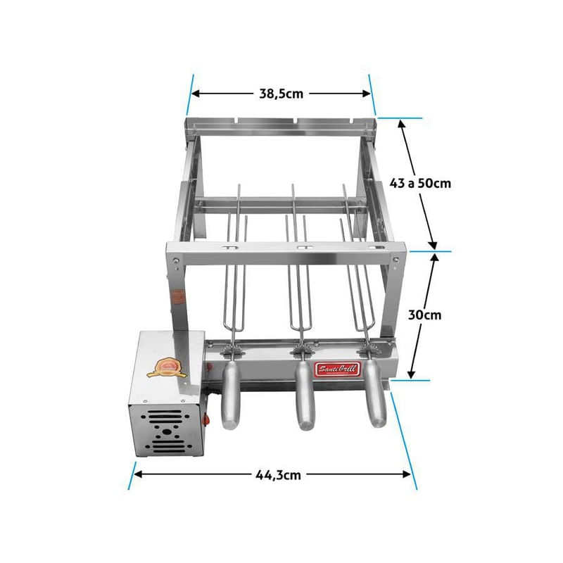 A SantiGrill lançou o Grill com Espetos Giratórios, ideal para adicionar um ‘’toque especial’’ ao churrasco, tenha maior agilidade, maior produtividade, asse a carne de maneira uniforme, deixando-a mais saborosa, pois o suco da carne gira em torno dela, evitando que a carne seque, sirva os convidados sem aquela constante preocupação em queimar seu churrasco....O Grill com Espetos Giratórios SantiGrill, vai com uma GRELHA PARRILHEIRA, tem um motor bivolt, todo produzido em aço inox, pratico e fácil de limpar. É o mais silencioso e com melhor acabamento do mercado, com ‘’ajuste de profundidade’’, vai ficar perfeito na sua churrasqueira ou na sua bancada de alvenaria.....Detalhes:..O produto vai pré-montado,.. Sem ponto de soldas,..Itens incluídos:..Três espetos Tridentes (madeira revestida com alumínio, conforto para não esquentar as mãos),..Uma Grelha Parrilheira....Medidas do Grill montado:..L 44,3 cm dianteira com motor, parte traseira 38,5 cm.. P 43 a 50m (ajustável)..A 30 cm..100% Aço Inox,..Motor Bivolt.