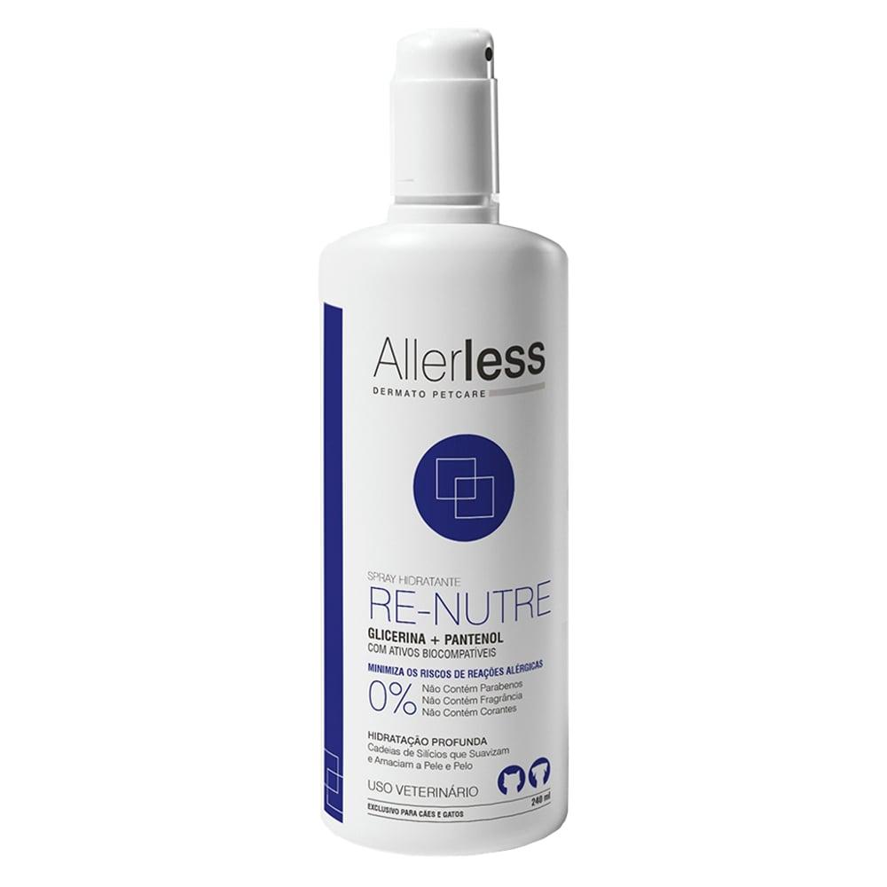 O Hidratante Allerless Spray Re-nutre É Uma Solução De Hidratação Para Cães E Gatos, Composto Por Glicerina E Pantenol. Livre De Parabenos, Fragrâncias E Corantes, Ele Oferece Uma Hidratação Profunda E Suaviza A Pele E O Pelo. Sua Fórmula Contém Ativos Biocompatíveis Que Imitam O Filme Hidrolipídico Natural Da Pele, Restaurando Os Lipídios Essenciais E Mantendo A Pele Hidratada. Indicado Para Pets Com Pele E Pelos Ressecados, É Uma Opção Eficaz De Cuidado E Revitalização.