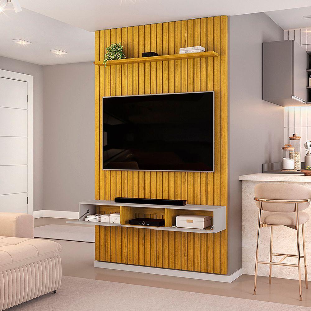 Com um design sofisticado e excelente aproveitamento de espaço, o Home Trento é a escolha ideal para quem busca unir elegância e funcionalidade na sala de estar. O painel comporta TVs de até 60", valorizando o ambiente com linhas modernas e acabamento refinado. O rack inferior oferece nichos amplos e portas basculantes que proporcionam organização para eletrônicos, livros e objetos decorativos, mantendo tudo ao alcance das mãos. Além disso, seus detalhes em ripado e o contraste entre as cores trazem um toque contemporâneo e acolhedor à decoração.