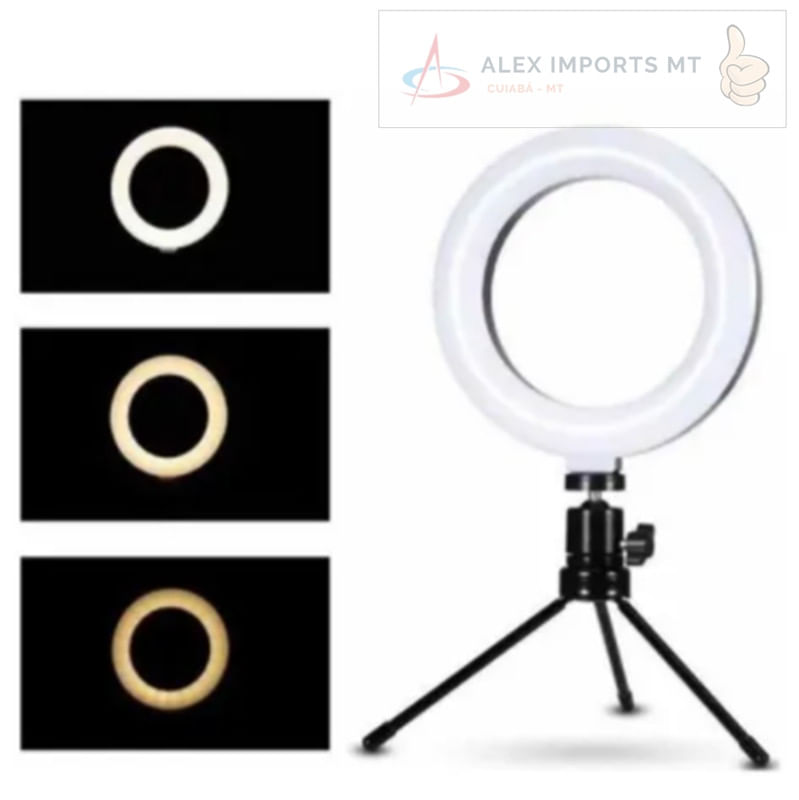 Ring Light 6 Polegadas Iluminação Led Make Unhas Foto Vídeo   Ring Light Iluminação Luz Led Make Selfie Unhas Foto Vídeo Iluminador Ring Light De 16 Centímetros (6,5 Polegadas), Desenvolvido Para Maquiadores, Fotógrafos, Cinegrafistas E Etc, Que Buscam Uma Ótima Maneira De Iluminar Com Perfeição. Você Pode Ajustar O Ângulo Da Iluminação Por Possuir Um Suporte Articulado. É Possível Controlar As Diferentes Temperaturas De Cores Através Do Controle De Ajuste Que Vai De 3500k À 5500k. Na Frente Dos Leds Tem Um Filtro Difusor Para Suavizar A Luz "espalhando" A Luz Com Maior Uniformidade. A Alimentação Do Iluminador É Através De Cabo Usb (não Acompanha Adaptador De Tomada E Não Possui Bateria Interna Recarregável), Você Pode Utilizar Um Adaptador De Tomada De Celular Para Ligar Ou Conectar No Usb Do Computador Ou Outro Equipamento Que Forneça 5v Usb. O Cabo Usb Deverá Estar Sempre Ligado Para Funcionar. O Encaixe Do Ring Ligth É Através De Encaixe Padrão De Tripés De Rosca. O Mini Tripé Também Serve Para Utilizar Em Outros Equipamentos De Até 1kg De Peso, Como Projetores, Celulares E Etc. É Recomendado E Extremamente Eficaz Para A Macro Fotografia, Fotografia Médica, Odontológica, Científica, Hobby E Para A Iluminação/fotografia De Produções De Maquiadores. Fácil De Usar, Durável E De Pouco Peso, Facilitando O Transporte. Especificações: Diâmetro : 16 Cm Alimentação: 5v Usb Comprimento Aproximado Do Cabo: 1,90m Temperatura De Cor: 3200k - 5500k Ajustável Ângulo Regulável: Sim Potência: 10w Acompanha: 1x Iluminador Circular 1x Mini Ballhead 1x Mini Tripé   Lembre-se , Tudo Que É Barato, Sai Caro    Segurança E Garantia, É Aqui : Alex Imports Mt