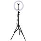 Iluminador Ring Light 10 Polegadas 25W 26cm com Tripé 120 Leds . .Itens do produto:. .01 Tripe de 1,80 metros.01 Iluminador Led Ring Light.01 Mini cabeça de bola.01 Suporte para smartphone - para celulares com largura de 5cm a 7,5cm.01 Pino adaptador rosca 1/4. .Iluminador de Estúdio Fotográfico Ring Light Led - 26cm. .Um iluminador completo, com botão para controle de intensidade e cor, chega de ficar tirando e colocando aquele filtro âmbar para alterar a temperatura de cor.. .Ideal para iluminação de rosto para retratos, maquiagem, videos youtube. Um iluminador de montagem simples e de fácil uso.. .Permite o uso com câmeras fotográficas de qualquer tipo e com smartphones. Acompanha o produto uma pino adaptador com rosca de 1/4, uma mini cabeça de bola, adaptador para smartphone.. .Possui base articulada permitindo inclinar o iluminador em vário ângulos e ser montado em tripés de iluminação que possuem bucha 5/8 -. .Características:. .Iluminador Ring Light Led.Número de leds: 120 leds brancos e amarelos.Temperatura de cor: ajustável por controle no fio ~2700k a ~5500k.Luminosidade: 1200 lumens - 25W).Intensidade: dimerizável por controle no fio.Dimensões aproximadamente: 26cm diametro.Peso aproximadamente: 950g.Fonte de alimentação: USB - bivolt 110V a 220V